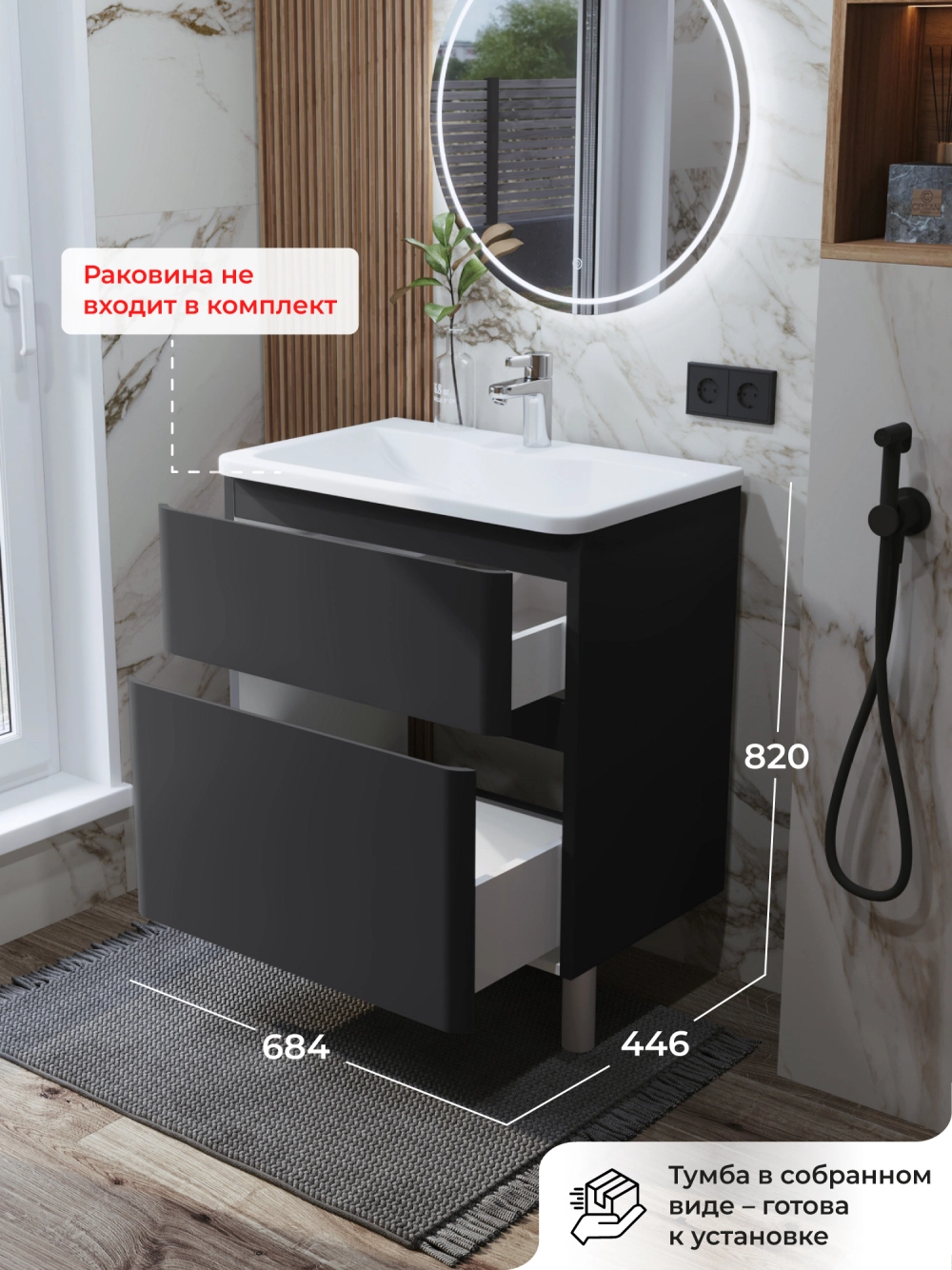 Напольная тумба под раковину в ванную из коллекции Роберто - это сочетание современной стилистики и богатого функционала. Тумба для ванны изготовлена из прочного МДФ, поэтому выдерживает высокие эксплуатационные нагрузки и обеспечивает дополнительную защиту тумбы под раковину от влаги и перепадов температуры. Качественная фурнитура с доводчиками обеспечивает легкое открывание и плавное закрывание ящиков. Вырез под сифон универсальный, для любого типа. Благодаря своей конструкции тумба обеспечивает удобный доступ к раковине и позволяет скрыть коммуникации. Тумба под раковину в ванную оснащена удобным ящиком для хранения, что позволяет разместить всё необходимое под рукой. Ручки интегрированы в фасад, что исключает возможность случайного удара о фурнитуру. Для точного выбора тумбы под раковину в ванную комнату рекомендуем обратиться к схеме замеров, которая находится на фото в карточке товара, размеры изделия могут отличаться +/-1 см в связи со спецификой производства. Тумба для ванной доставляется в предварительно собранном виде, надежно упакована.