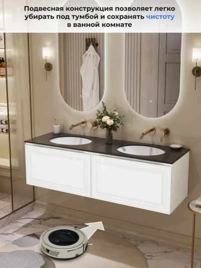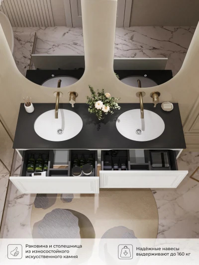 Представляем вашему вниманию великолепную тумбу с двумя раковинами Verona 2.0, которая станет настоящим украшением вашей ванной комнаты. Безупречный белый цвет и продуманная конструкция создают атмосферу роскоши и комфорта, идеально вписываясь в любой интерьер. Тумба изготовлена из высококачественного МДФ, который отличается повышенной прочностью и устойчивостью к влаге. Столешница из искусственного камня не только дополняет элегантный внешний вид изделия, но и обеспечивает долговечность и практичность в использовании. Искусственный камень устойчив к царапинам, не впитывает влагу и легко поддается уходу. Наличие двух раковин обеспечивает максимальный комфорт при использовании, а вместительные ящики позволяют организовать удобное хранение всех необходимых принадлежностей.