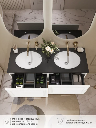 Представляем вашему вниманию великолепную тумбу с двумя раковинами Verona 2.0, которая станет настоящим украшением вашей ванной комнаты. Безупречный белый цвет и продуманная конструкция создают атмосферу роскоши и комфорта, идеально вписываясь в любой интерьер. Тумба изготовлена из высококачественного МДФ, который отличается повышенной прочностью и устойчивостью к влаге. Столешница из искусственного камня не только дополняет элегантный внешний вид изделия, но и обеспечивает долговечность и практичность в использовании. Искусственный камень устойчив к царапинам, не впитывает влагу и легко поддается уходу. Наличие двух раковин обеспечивает максимальный комфорт при использовании, а вместительные ящики позволяют организовать удобное хранение всех необходимых принадлежностей.