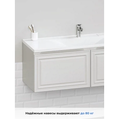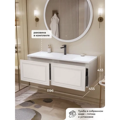 Подвесная тумба с раковиной из коллекции Verona станет настоящим украшением ванной комнаты в современном скандинавском стиле. Навесной способ установки тумбы в ванную дает возможность не только визуально увеличить пространство, но и обеспечивает быстрый и удобный доступ для уборки. Размеры подвесной тумбы с раковиной 1196х455х433 - идеальный выбор для ванной комнаты или туалета. Тумба для ванны изготовлена из прочного МДФ, поэтому выдерживает высокие эксплуатационные нагрузки. Корпус и фасады тумбы для ванной покрыты матовой пленкой, что обеспечивает дополнительную защиту тумбы с раковиной от влаги и перепадов температуры. Качественная фурнитура с доводчиками обеспечивает легкое открывание и плавное закрывание ящика. Вырез под сифон универсальный, для любого типа. Благодаря своей конструкции тумба в ванную обеспечивает удобный доступ к раковине и позволяет скрыть коммуникации. Тумба с раковиной в ванную оснащена удобным ящиком для хранения, что позволяет разместить всё необходимое под рукой. Ручки интегрированы в фасад дверки шкафчика, что исключает возможность случайного удара о фурнитуру. Для точного выбора подвесной тумбы с раковиной в ванную комнату рекомендуем обратиться к схеме замеров, которая находится на третьем фото в карточке товара, размеры изделия могут отличаться +/-1 см в связи со спецификой производства. Тумба для ванной доставляется в предварительно собранном виде, надежно упакована.