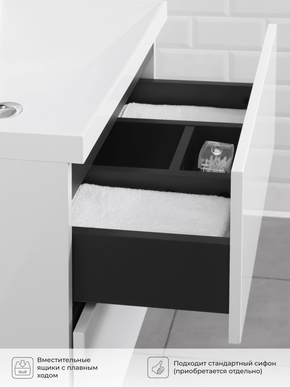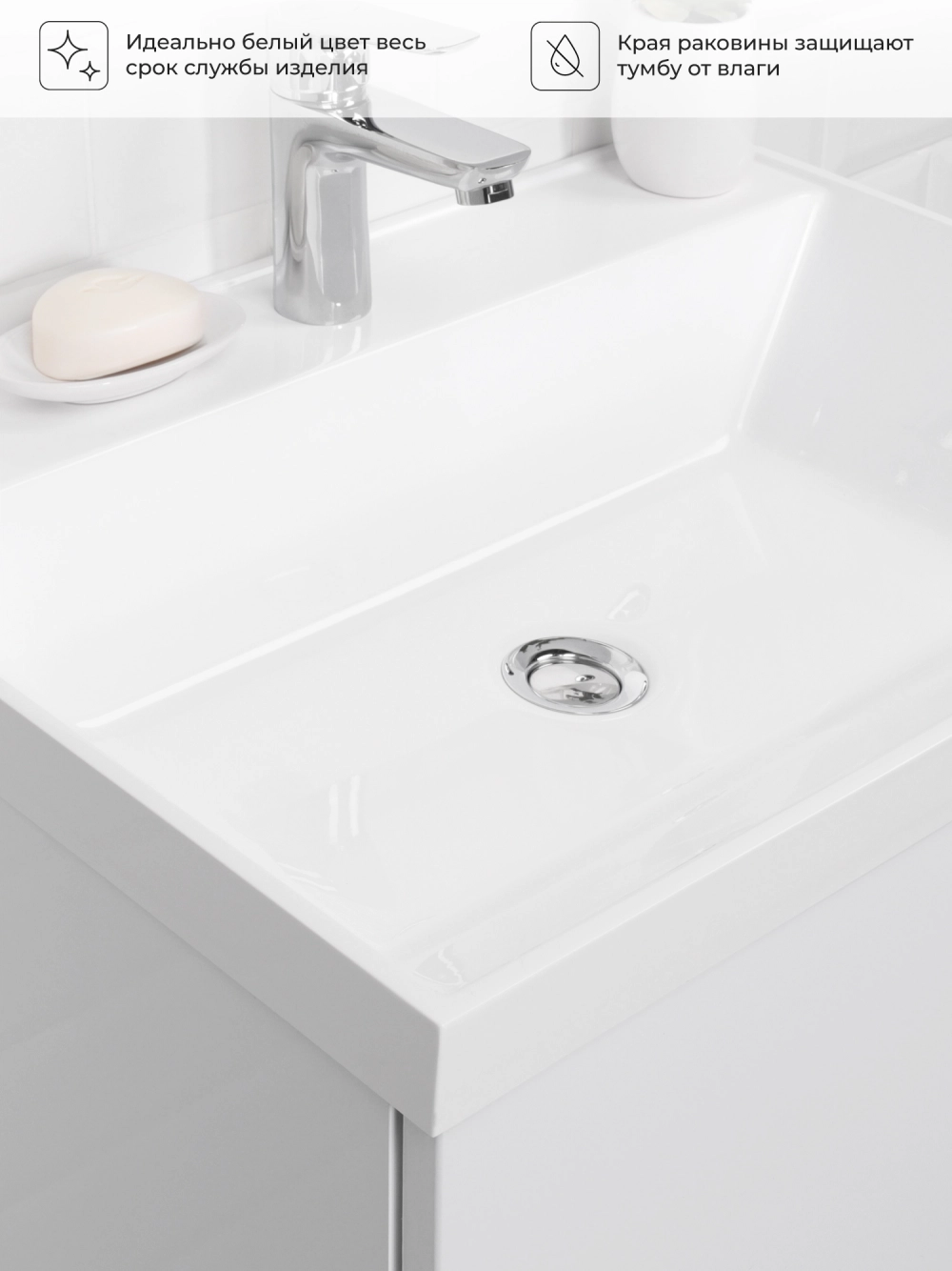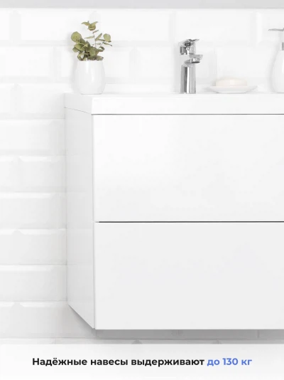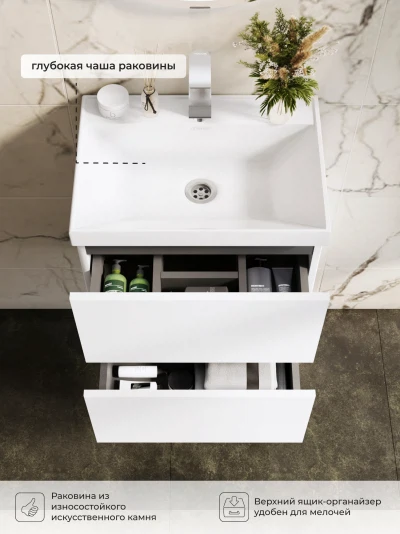 Подвесная тумба с раковиной в ванную комнату из коллекции Icon - это сочетание современной стилистики и богатого функционала. Навесной способ установки тумбы в ванную дает возможность не только визуально увеличить пространство, но и обеспечивает быстрый и удобный доступ для уборки. Размеры подвесной тумбы с раковиной - идеальный выбор для ванной комнаты или туалета. Качественная фурнитура с доводчиками обеспечивает легкое открывание и плавное закрывание ящиков. Тумба с раковиной с двумя ящиками, где можно рационально распределить и разместить все необходимые вещи для ванной комнаты. Вырез под сифон универсальный, для любого типа сифона. Раковина из искусственного камня – это безупречная гладкость поверхности, на которой не задерживаются загрязнения. Для точного выбора тумбы с раковиной в ванную комнату рекомендуем обратиться к схеме замеров, которая находится на фото в карточке товара, размеры изделия могут отличаться +/-1 см в связи со спецификой производства. Тумба с раковиной для ванной доставляется в предварительно собранном виде, надежно упакована.