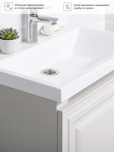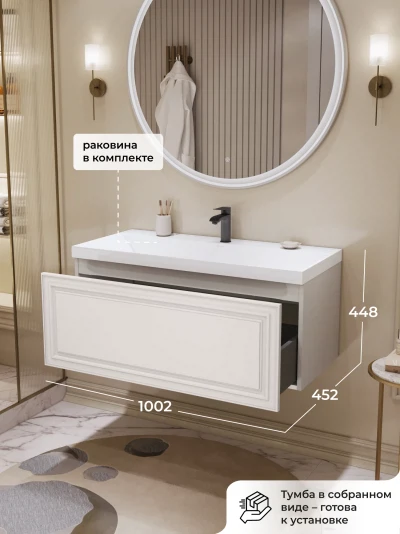Подвесная тумба с раковиной из коллекции Verona станет настоящим украшением ванной комнаты в современном скандинавском стиле. Навесной способ установки тумбы в ванную дает возможность не только визуально увеличить пространство, но и обеспечивает быстрый и удобный доступ для уборки. Размеры подвесной тумбы с раковиной 1002х452х448 - идеальный выбор для ванной комнаты или туалета. Тумба для ванны изготовлена из прочного МДФ, поэтому выдерживает высокие эксплуатационные нагрузки. Качественная фурнитура с доводчиками обеспечивает легкое открывание и плавное закрывание ящика. Вырез под сифон универсальный, для любого типа. Благодаря своей конструкции тумба в ванную обеспечивает удобный доступ к раковине и позволяет скрыть коммуникации. Тумба с раковиной в ванную оснащена удобным ящиком для хранения, что позволяет разместить всё необходимое под рукой. Ручки интегрированы в фасад дверки шкафчика, что исключает возможность случайного удара о фурнитуру. Для точного выбора подвесной тумбы с раковиной в ванную комнату рекомендуем обратиться к схеме замеров, которая находится на третьем фото в карточке товара, размеры изделия могут отличаться +/-1 см в связи со спецификой производства. Тумба для ванной доставляется в предварительно собранном виде, надежно упакована.