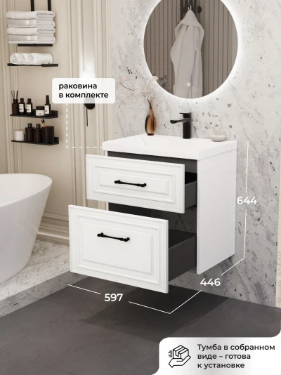 Подвесная тумба с раковиной из коллекции Verona станет настоящим украшением ванной комнаты в современном скандинавском стиле. Навесной способ установки тумбы в ванную дает возможность не только визуально увеличить пространство, но и обеспечивает быстрый и удобный доступ для уборки. Размеры подвесной тумбы с раковиной 597х446х644 - идеальный выбор для ванной комнаты или туалета. Тумба для ванны изготовлена из прочного МДФ, поэтому выдерживает высокие эксплуатационные нагрузки. Качественная фурнитура с доводчиками обеспечивает легкое открывание и плавное закрывание ящика. Вырез под сифон универсальный, для любого типа. Благодаря своей конструкции тумба в ванную обеспечивает удобный доступ к раковине и позволяет скрыть коммуникации. Тумба с раковиной в ванную оснащена удобным ящиком для хранения, что позволяет разместить всё необходимое под рукой. Ручки интегрированы в фасад дверки шкафчика, что исключает возможность случайного удара о фурнитуру. Для точного выбора подвесной тумбы с раковиной в ванную комнату рекомендуем обратиться к схеме замеров, которая находится на третьем фото в карточке товара, размеры изделия могут отличаться +/-1 см в связи со спецификой производства. Тумба для ванной доставляется в предварительно собранном виде, надежно упакована.
