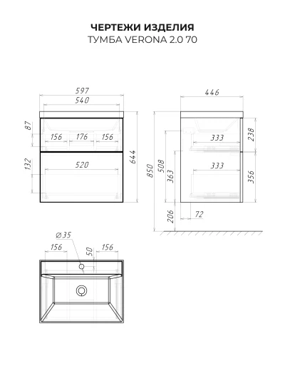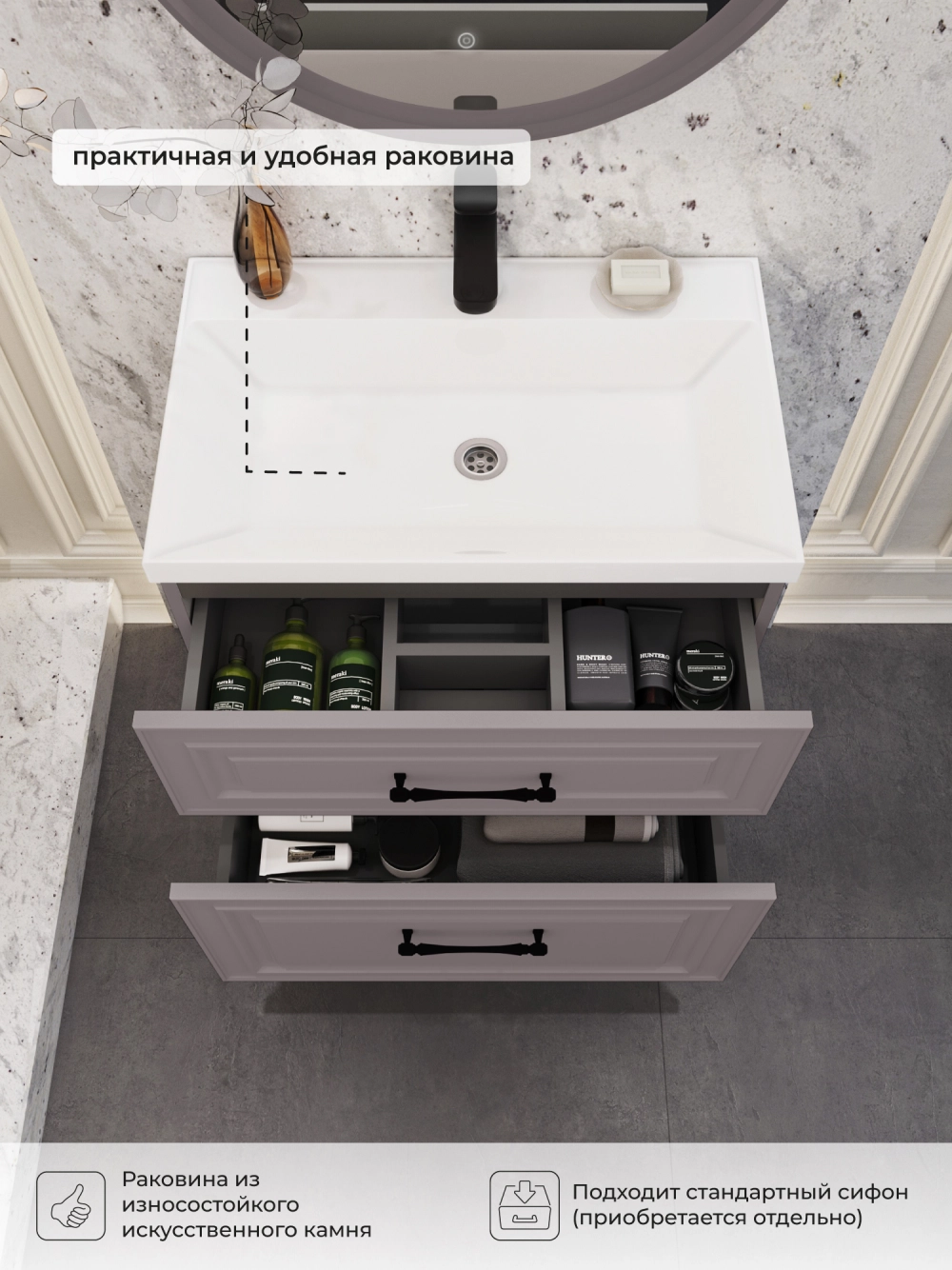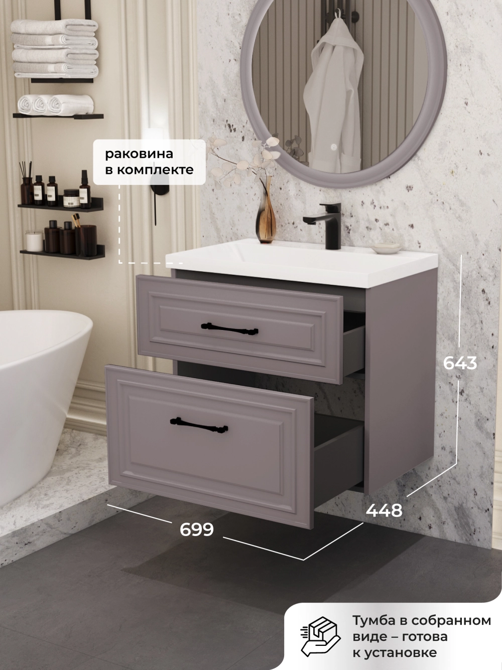 Подвесная тумба с раковиной из коллекции Verona станет настоящим украшением ванной комнаты в современном скандинавском стиле. Навесной способ установки тумбы в ванную дает возможность не только визуально увеличить пространство, но и обеспечивает быстрый и удобный доступ для уборки. Размеры подвесной тумбы с раковиной 699х448х643 - идеальный выбор для ванной комнаты или туалета. Тумба для ванны изготовлена из прочного МДФ, поэтому выдерживает высокие эксплуатационные нагрузки. Корпус и фасады тумбы для ванной покрыты матовой пленкой, что обеспечивает дополнительную защиту тумбы с раковиной от влаги и перепадов температуры. Качественная фурнитура с доводчиками обеспечивает легкое открывание и плавное закрывание ящика. Вырез под сифон универсальный, для любого типа. Благодаря своей конструкции тумба в ванную обеспечивает удобный доступ к раковине и позволяет скрыть коммуникации. Тумба с раковиной в ванную оснащена удобным ящиком для хранения, что позволяет разместить всё необходимое под рукой. Ручки интегрированы в фасад дверки шкафчика, что исключает возможность случайного удара о фурнитуру. Для точного выбора подвесной тумбы с раковиной в ванную комнату рекомендуем обратиться к схеме замеров, которая находится на третьем фото в карточке товара, размеры изделия могут отличаться +/-1 см в связи со спецификой производства. Тумба для ванной доставляется в предварительно собранном виде, надежно упакована.