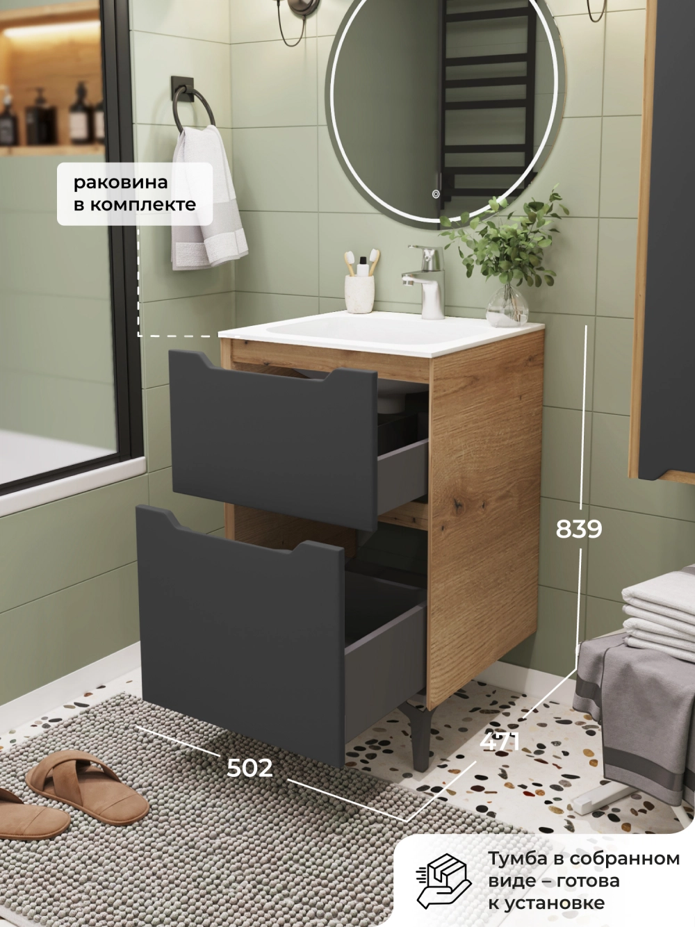 Напольная тумба с раковиной в ванную комнату из коллекции Nill - это сочетание современной стилистики и богатого функционала. Размеры подвесной тумбы с раковиной 502х471х839 - идеальный выбор для ванной комнаты или туалета. Ручки интегрированы в фасад ящика, что исключает возможность случайного удара о фурнитуру. Качественная фурнитура с доводчиками обеспечивает легкое открывание и плавное закрывание ящиков. Тумба с раковиной с двумя ящиками, где можно рационально распределить и разместить все необходимые вещи для ванной комнаты. Вырез под сифон универсальный, для любого типа сифона. Раковина из искусственного камня – это безупречная гладкость поверхности, на которой не задерживаются загрязнения. Для точного выбора тумбы с раковиной в ванную комнату рекомендуем обратиться к схеме замеров, которая находится на фото в карточке товара, размеры изделия могут отличаться +/-1 см в связи со спецификой производства. Тумба с раковиной для ванной доставляется в предварительно собранном виде, надежно упакована.