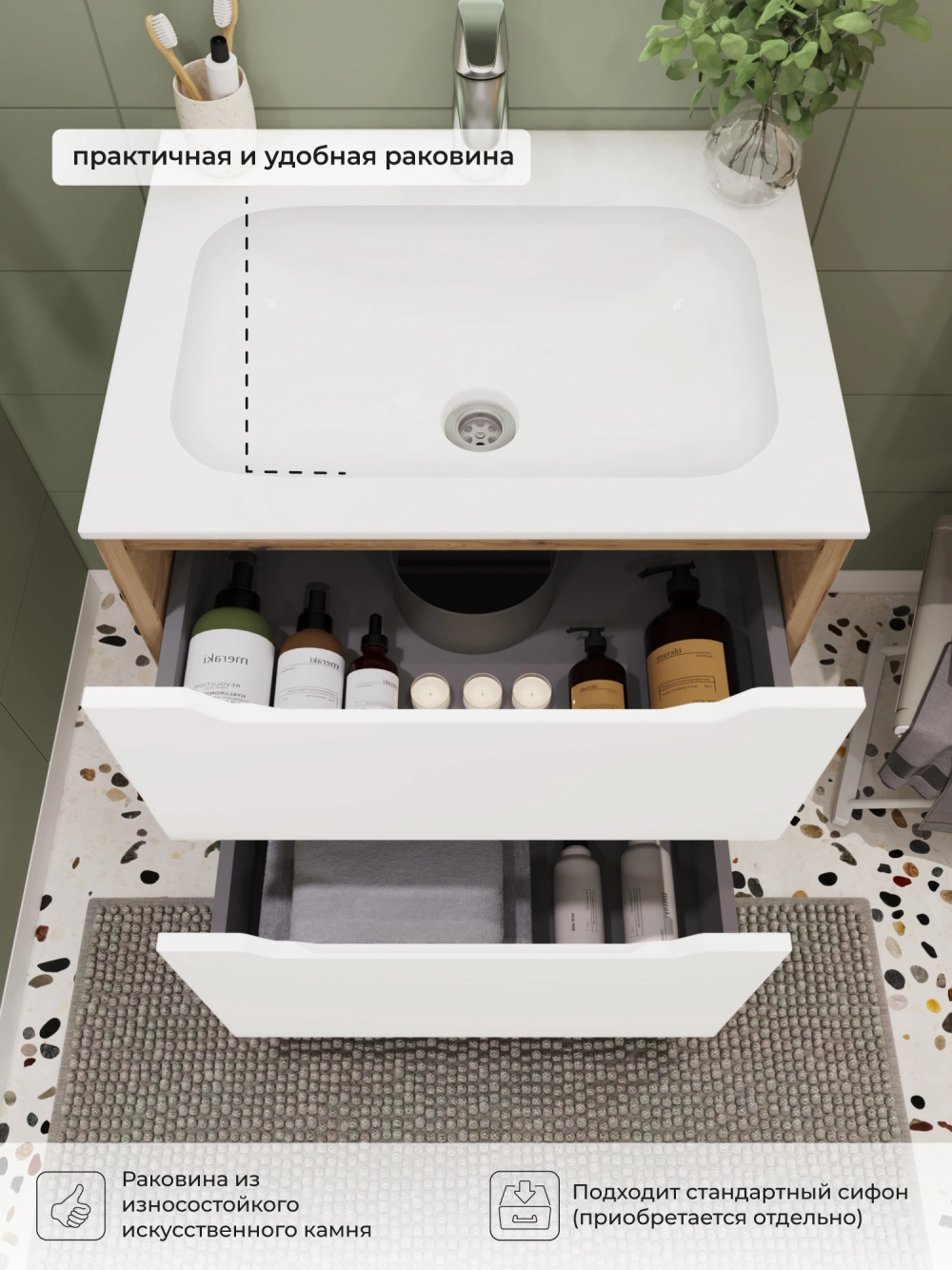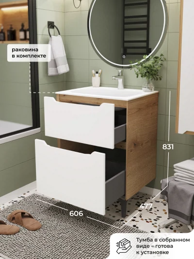 Напольная тумба с раковиной в ванную комнату из коллекции Nill - это сочетание современной стилистики и богатого функционала. Размеры подвесной тумбы с раковиной 606х477х831 - идеальный выбор для ванной комнаты или туалета. Ручки интегрированы в фасад ящика, что исключает возможность случайного удара о фурнитуру. Качественная фурнитура с доводчиками обеспечивает легкое открывание и плавное закрывание ящиков. Тумба с раковиной с двумя ящиками, где можно рационально распределить и разместить все необходимые вещи для ванной комнаты. Вырез под сифон универсальный, для любого типа сифона. Раковина из искусственного камня – это безупречная гладкость поверхности, на которой не задерживаются загрязнения. Для точного выбора тумбы с раковиной в ванную комнату рекомендуем обратиться к схеме замеров, которая находится на фото в карточке товара, размеры изделия могут отличаться +/-1 см в связи со спецификой производства. Тумба с раковиной для ванной доставляется в предварительно собранном виде, надежно упакована.