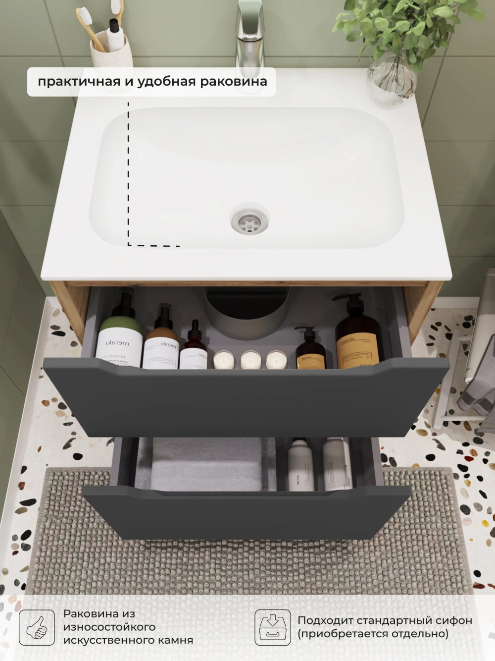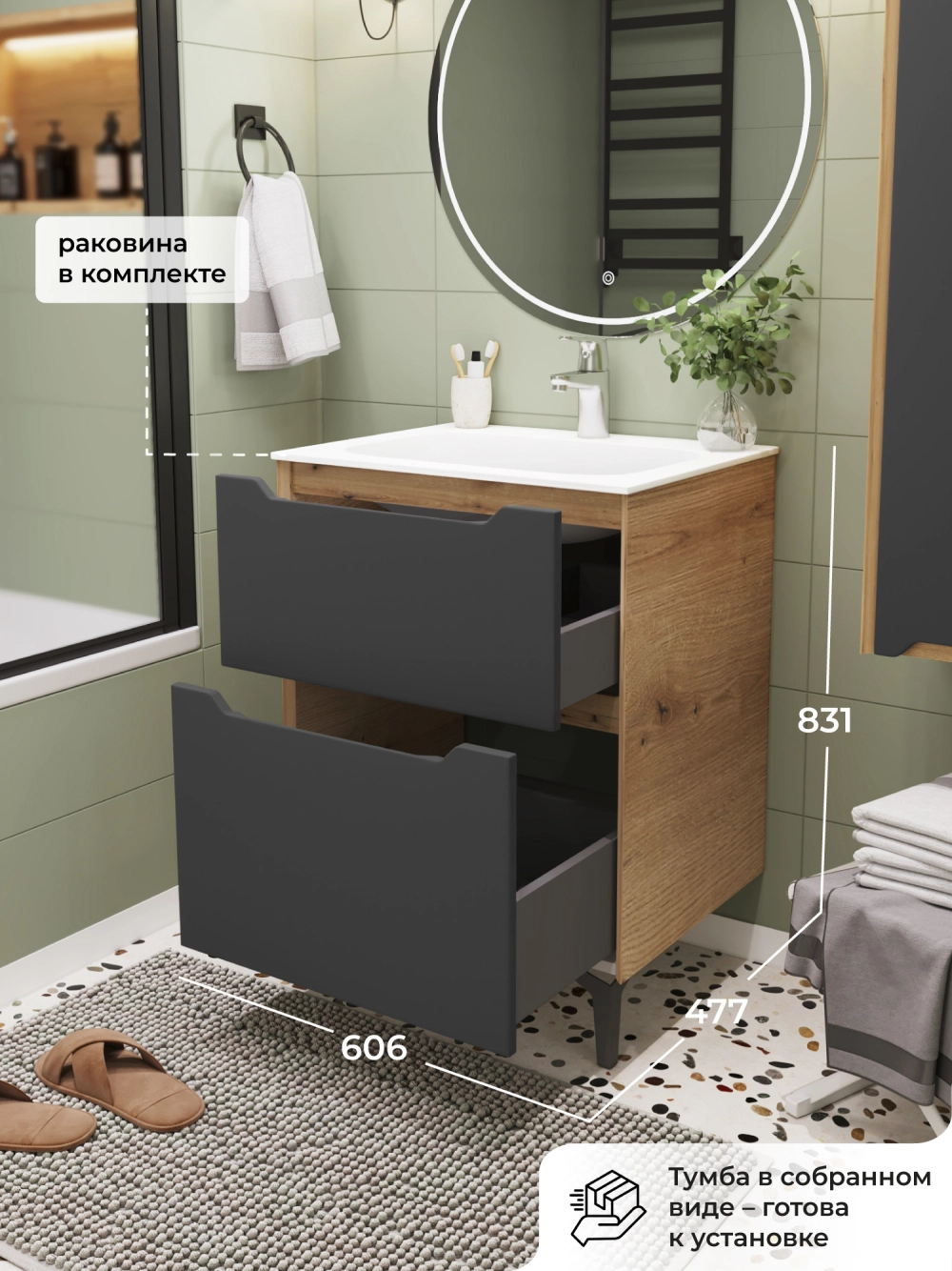 Напольная тумба с раковиной в ванную комнату из коллекции Nill - это сочетание современной стилистики и богатого функционала. Размеры подвесной тумбы с раковиной 606х477х831 - идеальный выбор для ванной комнаты или туалета. Ручки интегрированы в фасад ящика, что исключает возможность случайного удара о фурнитуру. Качественная фурнитура с доводчиками обеспечивает легкое открывание и плавное закрывание ящиков. Тумба с раковиной с двумя ящиками, где можно рационально распределить и разместить все необходимые вещи для ванной комнаты. Вырез под сифон универсальный, для любого типа сифона. Раковина из искусственного камня – это безупречная гладкость поверхности, на которой не задерживаются загрязнения. Для точного выбора тумбы с раковиной в ванную комнату рекомендуем обратиться к схеме замеров, которая находится на фото в карточке товара, размеры изделия могут отличаться +/-1 см в связи со спецификой производства. Тумба с раковиной для ванной доставляется в предварительно собранном виде, надежно упакована.
