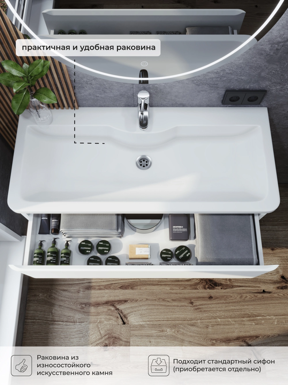Напольная тумба с раковиной в ванную из коллекции Roberto - это сочетание современной стилистики и богатого функционала. Тумба для ванны изготовлена из прочного МДФ, поэтому выдерживает высокие эксплуатационные нагрузк и обеспечивает дополнительную защиту тумбы с раковиной от влаги и перепадов температуры. Качественная фурнитура с доводчиками обеспечивает легкое открывание и плавное закрывание ящиков. Вырез под сифон универсальный, для любого типа. Благодаря своей конструкции тумба обеспечивает удобный доступ к раковине и позволяет скрыть коммуникации. Тумба с раковиной в ванную оснащена удобным ящиком для хранения, что позволяет разместить всё необходимое под рукой. Ручки интегрированы в фасад, что исключает возможность случайного удара о фурнитуру. Для точного выбора тумбы с раковиной в ванную комнату рекомендуем обратиться к схеме замеров, которая находится на фото в карточке товара, размеры изделия могут отличаться +/-1 см в связи со спецификой производства. Тумба для ванной доставляется в предварительно собранном виде, надежно упакована.