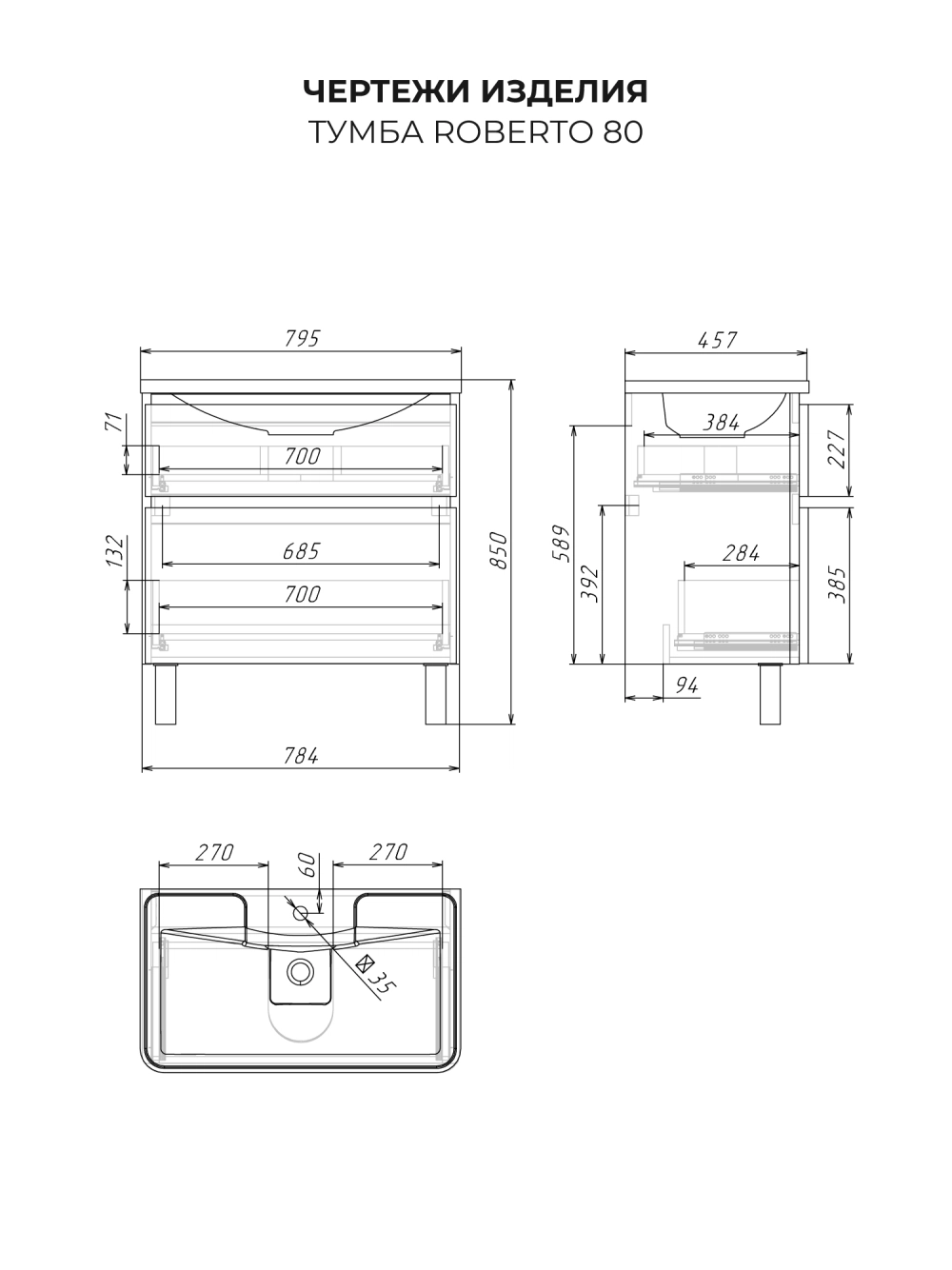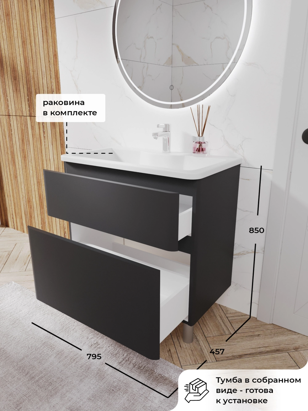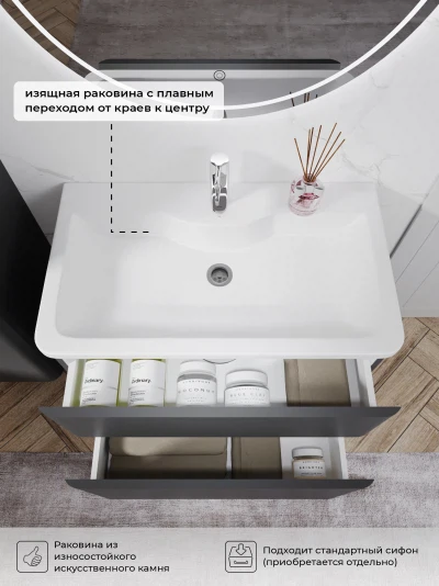 Тумба с раковиной напольная Итана Roberto 80 с выдвижными ящиками Графит