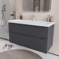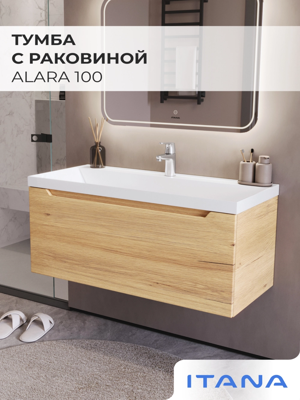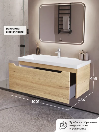 Тумба с раковиной в ванную Итана из коллекции Alara. Тумба в ванную отличается элегантным дизайном и качественным исполнением, прекрасно сочетая функциональность и эстетическую привлекательность. Размеры подвесной тумбы с раковиной 1001*454*448 - идеальный выбор для ванной комнаты или туалета. Подвесная конструкция тумбы с раковиной позволяет сэкономить место на полу и визуально расширяет пространство. Тумба с раковиной в ванную подвесная выполнена из МФД, что гарантирует долговечность эксплуатации и износостойкость. Качественная фурнитура с доводчиками обеспечивает легкое открывание и плавное закрывание ящика. Тумба с раковиной с одним ящиком, в нем можно рационально распределить и разместить все необходимые вещи для ванной комнаты. Для точного выбора тумбы рекомендуем обратиться к схеме замеров, которая находится на фото в карточке товара. Размеры изделия могут отличаться +/-1 см в связи со спецификой производства. Подвесная тумба с раковиной приходит в надежной упаковке и в собранном виде.