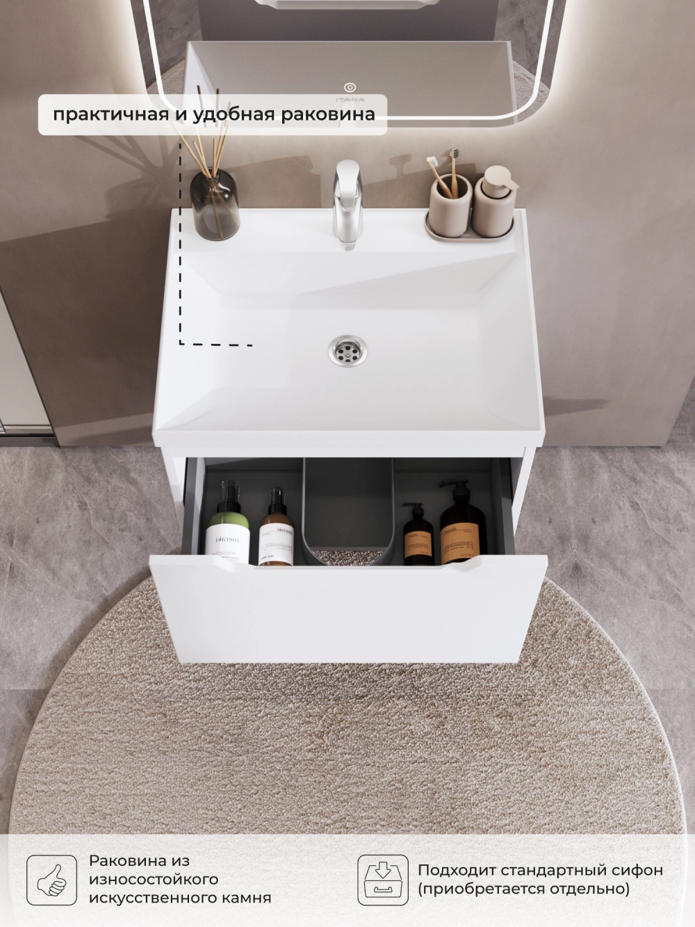 Представляем вашему вниманию стильную подвесную тумбу с раковиной Итана Alara, выполненную белом цвете. Этот аксессуар для ванной комнаты идеально сочетает в себе функциональность и современный дизайн. Размеры тумбы обеспечивают достаточное пространство для хранения необходимых предметов.<br>Благодаря своему лаконичному и компактному дизайну, этот элемент мебели не только делает пространство более стильным, но и помогает эффективно организовать хранение. Она станет отличным решением для тех, кто ценит минимализм и удобство. Подвесная тумба обеспечивает легкость уборки под ней и визуально увеличивает пространство. Изготавливается из качественных материалов, что гарантирует долговечность и износостойкость. Конструкция предполагает простоту монтажа и эксплуатации. Тумба обязательно дополнит вашу ванную, сделает её более уютной и функциональной.
