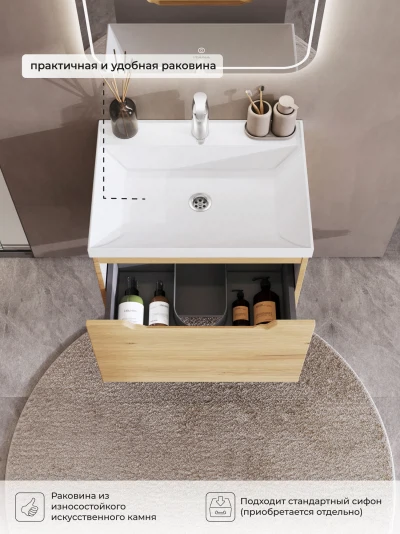 Тумба с раковиной в ванную Итана из коллекции Alara. Тумба в ванную отличается элегантным дизайном и качественным исполнением, прекрасно сочетая функциональность и эстетическую привлекательность. Размеры подвесной тумбы с раковиной 597*446*444 - идеальный выбор для ванной комнаты или туалета. Подвесная конструкция тумбы с раковиной позволяет сэкономить место на полу и визуально расширяет пространство. Тумба с раковиной в ванную подвесная выполнена из МФД, что гарантирует долговечность эксплуатации и износостойкость. Качественная фурнитура с доводчиками обеспечивает легкое открывание и плавное закрывание ящика. Тумба с раковиной с одним ящиком, в нем можно рационально распределить и разместить все необходимые вещи для ванной комнаты. Для точного выбора тумбы рекомендуем обратиться к схеме замеров, которая находится на фото в карточке товара. Размеры изделия могут отличаться +/-1 см в связи со спецификой производства. Подвесная тумба с раковиной приходит в надежной упаковке и в собранном виде.