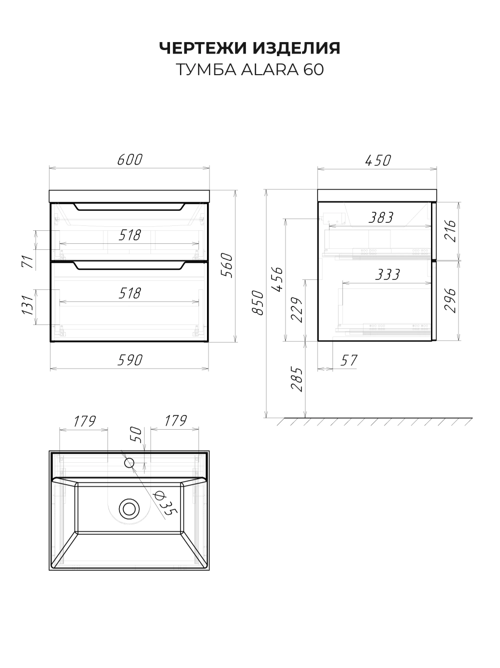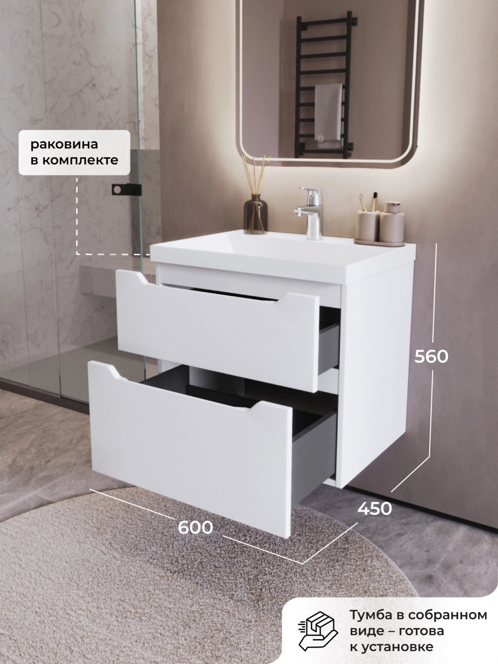 Тумба с раковиной в ванную Итана из коллекции Alara. Тумба в ванную отличается элегантным дизайном и качественным исполнением, прекрасно сочетая функциональность и эстетическую привлекательность. Размеры подвесной тумбы с раковиной 600*450*560 - идеальный выбор для ванной комнаты или туалета. Подвесная конструкция тумбы с раковиной позволяет сэкономить место на полу и визуально расширяет пространство. Тумба с раковиной в ванную подвесная выполнена из МФД, что гарантирует долговечность эксплуатации и износостойкость. Качественная фурнитура с доводчиками обеспечивает легкое открывание и плавное закрывание ящиков. Тумба с раковиной с двумя ящиками, где можно рационально распределить и разместить все необходимые вещи для ванной комнаты. Для точного выбора тумбы рекомендуем обратиться к схеме замеров, которая находится на фото в карточке товара. Размеры изделия могут отличаться +/-1 см в связи со спецификой производства. Подвесная тумба с раковиной приходит в надежной упаковке и в собранном виде.