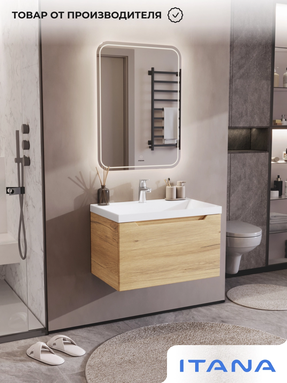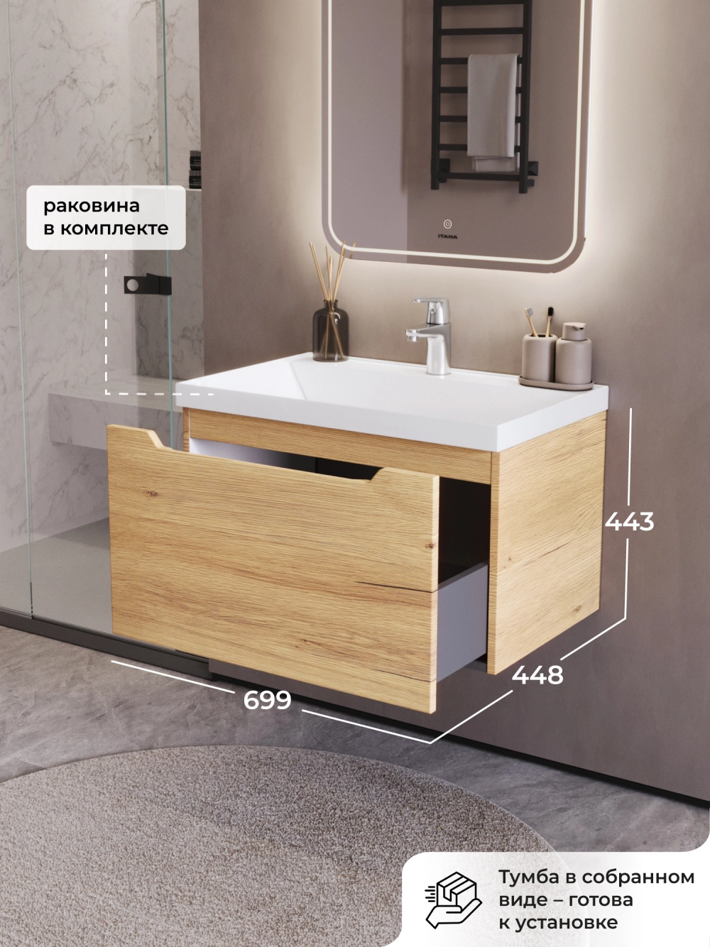 Тумба с раковиной в ванную Итана из коллекции Alara. Тумба в ванную отличается элегантным дизайном и качественным исполнением, прекрасно сочетая функциональность и эстетическую привлекательность. Размеры подвесной тумбы с раковиной 699*448*443 - идеальный выбор для ванной комнаты или туалета. Подвесная конструкция тумбы с раковиной позволяет сэкономить место на полу и визуально расширяет пространство. Тумба с раковиной в ванную подвесная выполнена из МФД, что гарантирует долговечность эксплуатации и износостойкость. Качественная фурнитура с доводчиками обеспечивает легкое открывание и плавное закрывание ящика. Тумба с раковиной с одним ящиком, в нем можно рационально распределить и разместить все необходимые вещи для ванной комнаты. Для точного выбора тумбы рекомендуем обратиться к схеме замеров, которая находится на фото в карточке товара. Размеры изделия могут отличаться +/-1 см в связи со спецификой производства. Подвесная тумба с раковиной приходит в надежной упаковке и в собранном виде.