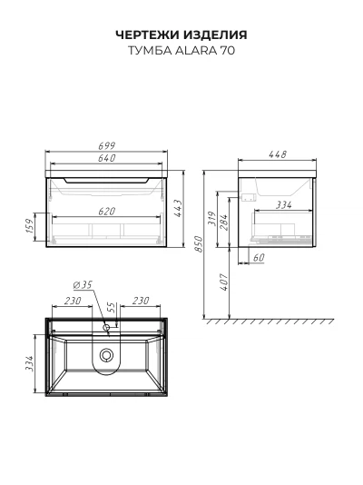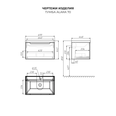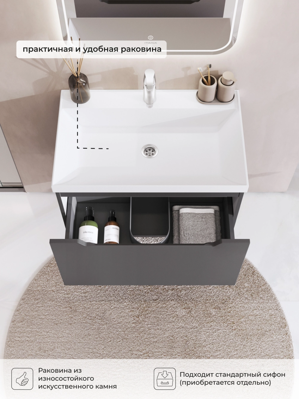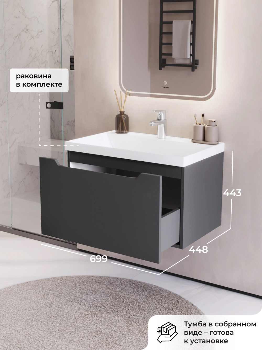 Тумба с раковиной подвесная Итана Alara 70 с выдвижным ящиком Графит