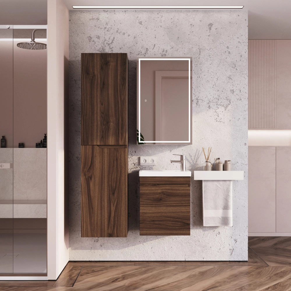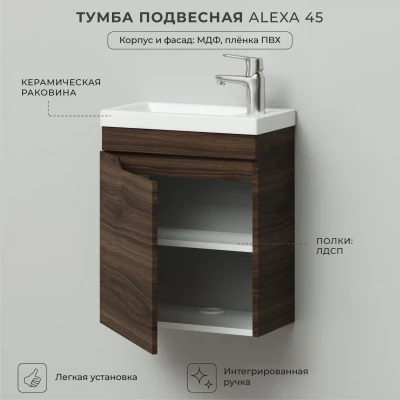 Тумба с раковиной подвесная Итана Alexa 45 с распашной дверцей левая узкая Орех Пекан шоколад стронг