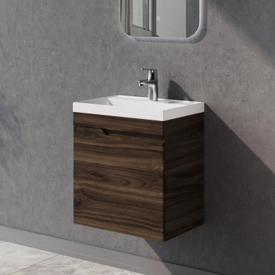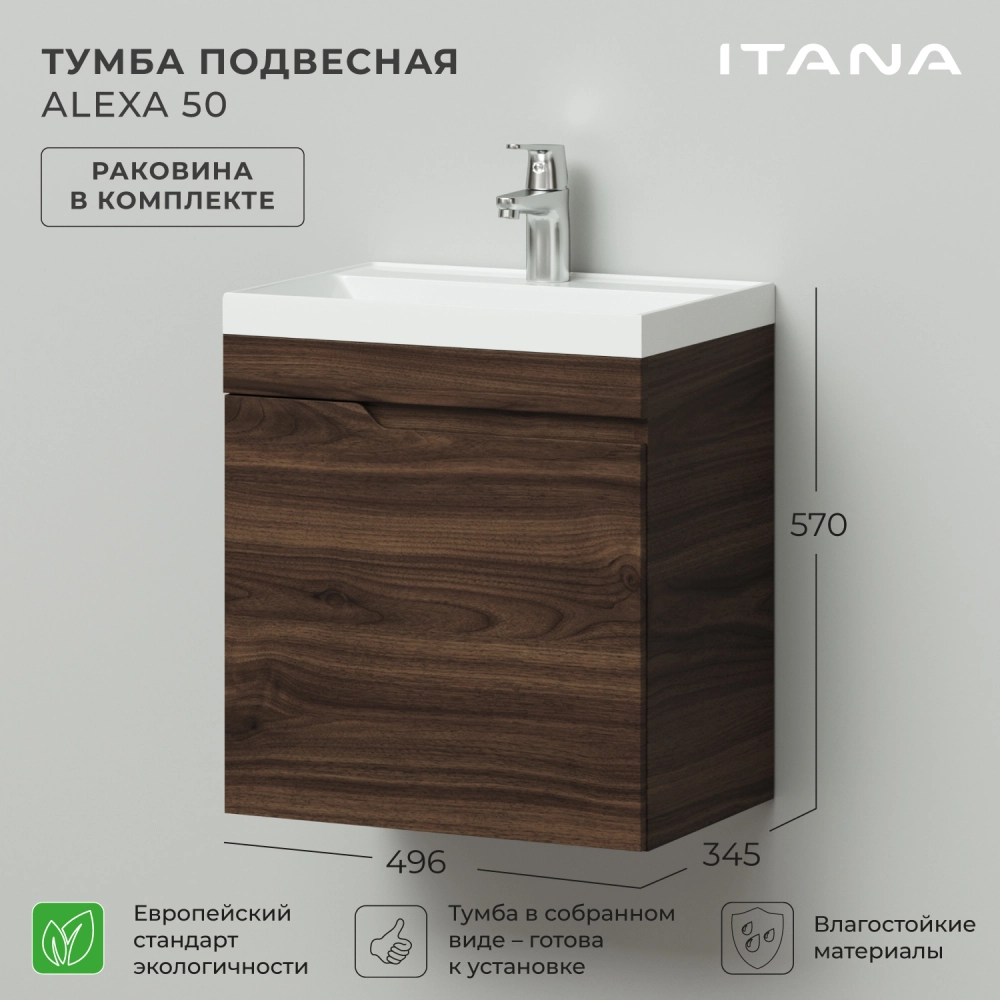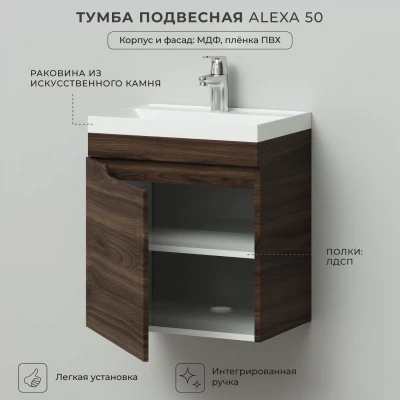 Тумба с раковиной подвесная Итана Alexa 50 с распашной дверцей левая Орех Пекан шоколад стронг