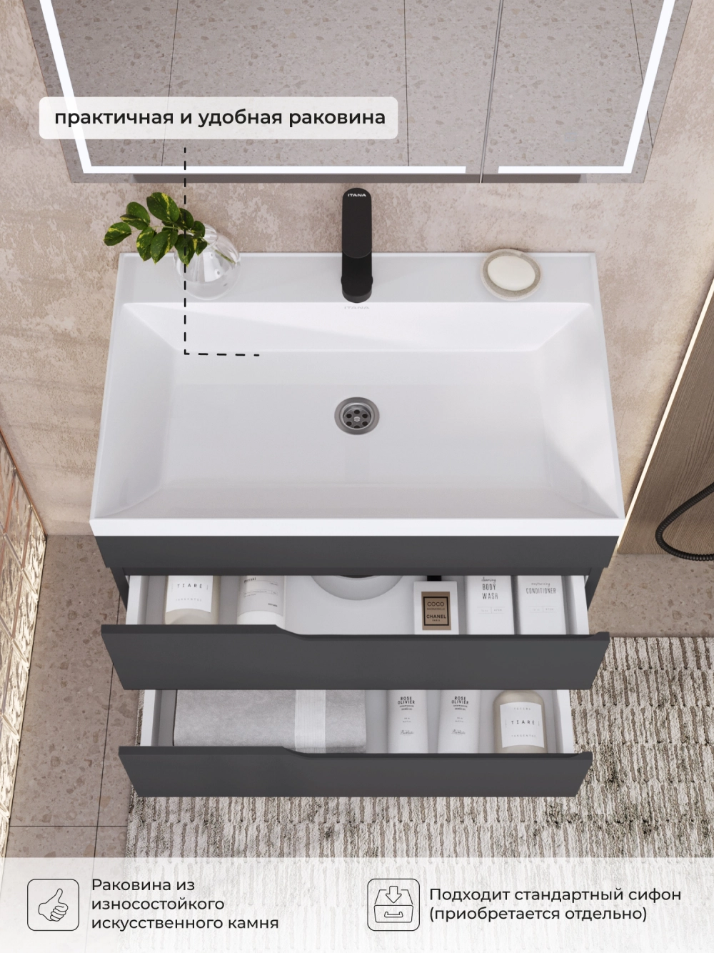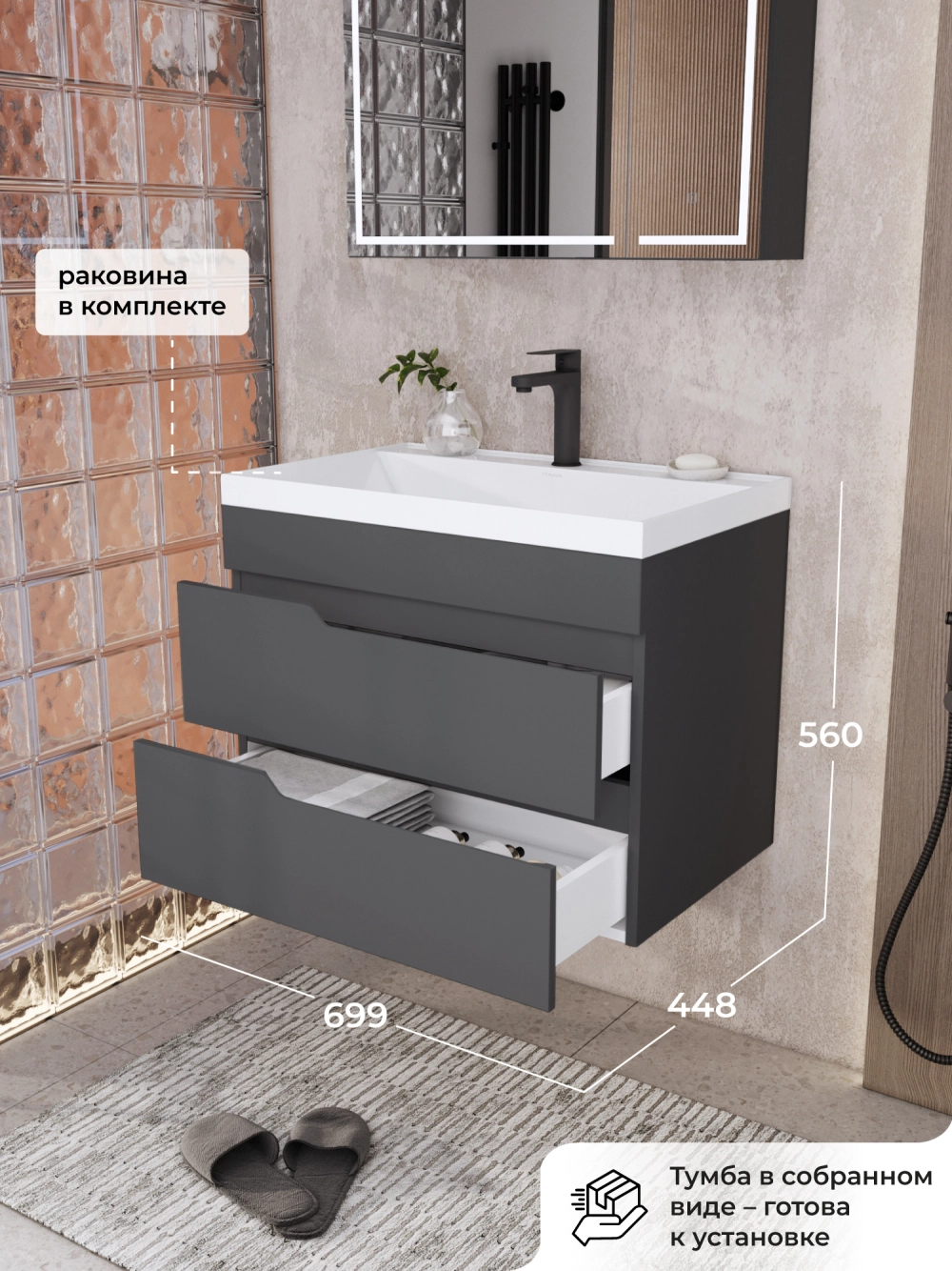 Тумба с раковиной подвесная Итана Alexa 70 с выдвижными ящиками Графит