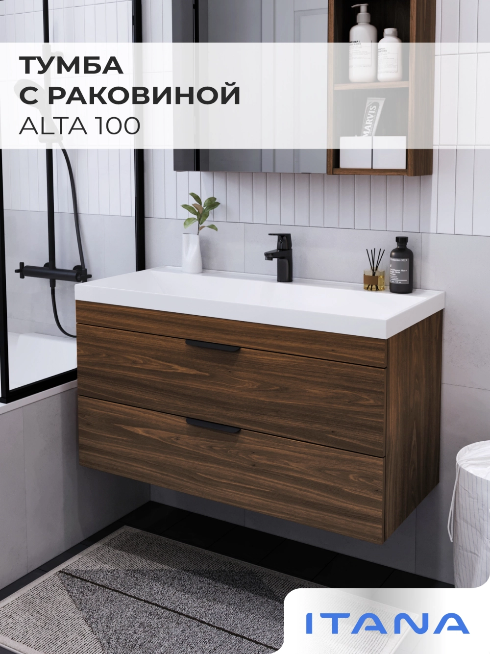 Тумба с раковиной подвесная Итана Alta 100 с выдвижными ящиками под умывальник Clarissa 100 Дуб бурбон