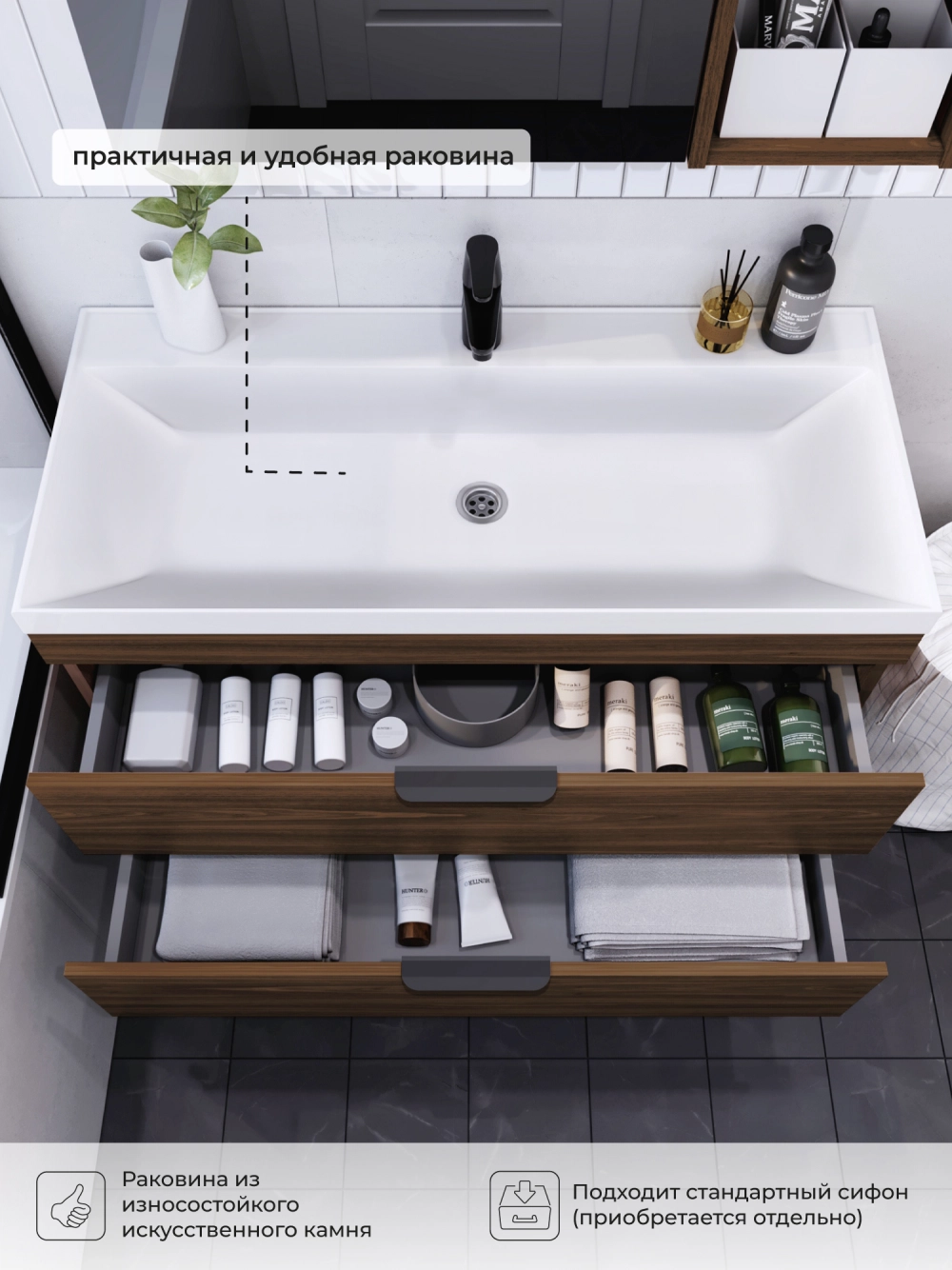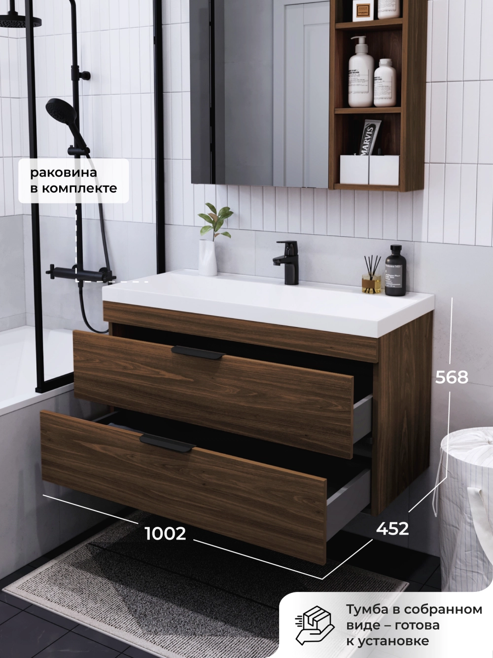 Подвесная тумба с раковиной из коллекции Alta станет настоящим украшением ванной комнаты в современном стиле. Навесной способ установки тумбы в ванную дает возможность не только визуально увеличить пространство, но и обеспечивает быстрый и удобный доступ для уборки. Размеры подвесной тумбы с раковиной 1002*452*568 - идеальный выбор для ванной комнаты или туалета.Тумба с раковиной изготовлена из ламинированного ДСП, поэтому выдерживает высокие эксплуатационные нагрузки. Качественная фурнитура с доводчиками обеспечивает легкое открывание и плавное закрывание ящиков. Вырез под сифон универсальный, для любого типа. Благодаря своей конструкции тумба обеспечивает удобный доступ к раковине и позволяет скрыть коммуникации. Тумба с раковиной в ванную оснащена двумя удобными ящиками для хранения, что позволяет разместить всё необходимое под рукой. Раковина из искусственного камня– это безупречная гладкость поверхности, на которой не задерживаются загрязнения. Для точного выбора подвесной тумбы с раковиной в ванную комнату рекомендуем обратиться к схеме замеров, которая находится на фото в карточке товара, размеры изделия могут отличаться +/-1 см в связи со спецификой производства. Тумба для ванной доставляется в предварительно собранном виде, надежно упакована.