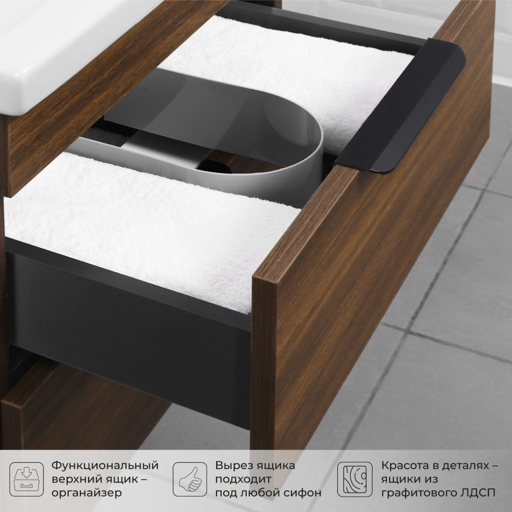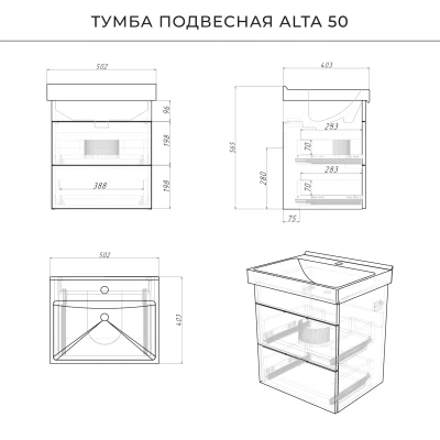Подвесная тумба с раковиной из коллекции Alta станет настоящим украшением ванной комнаты в современном стиле. Навесной способ установки тумбы в ванную дает возможность не только визуально увеличить пространство, но и обеспечивает быстрый и удобный доступ для уборки. Размеры подвесной тумбы с раковиной 500*403*530 - идеальный выбор для ванной комнаты или туалета.Тумба с раковиной изготовлена из ламинированного ДСП, поэтому выдерживает высокие эксплуатационные нагрузки. Качественная фурнитура с доводчиками обеспечивает легкое открывание и плавное закрывание ящиков. Вырез под сифон универсальный, для любого типа. Благодаря своей конструкции тумба обеспечивает удобный доступ к раковине и позволяет скрыть коммуникации. Тумба с раковиной в ванную оснащена двумя удобными ящиками для хранения, что позволяет разместить всё необходимое под рукой. Раковина из искусственного камня– это безупречная гладкость поверхности, на которой не задерживаются загрязнения. Для точного выбора подвесной тумбы с раковиной в ванную комнату рекомендуем обратиться к схеме замеров, которая находится на фото в карточке товара, размеры изделия могут отличаться +/-1 см в связи со спецификой производства. Тумба для ванной доставляется в предварительно собранном виде, надежно упакована.