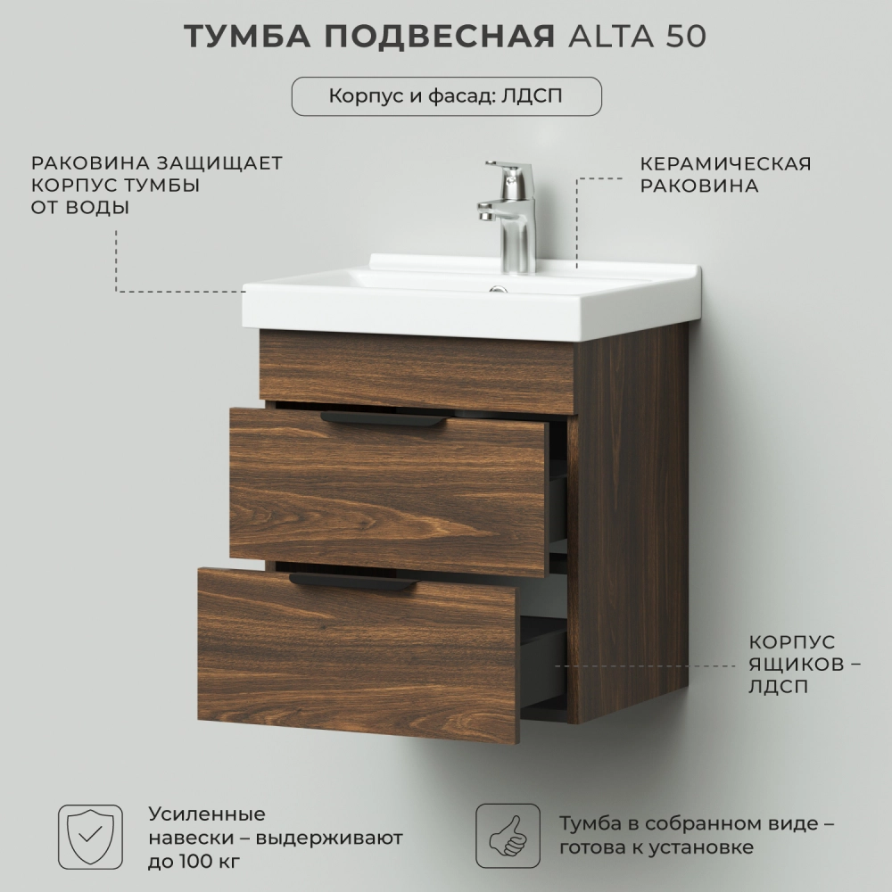 Тумба с раковиной подвесная Итана Alta 50 с выдвижными ящиками Дуб бурбон
