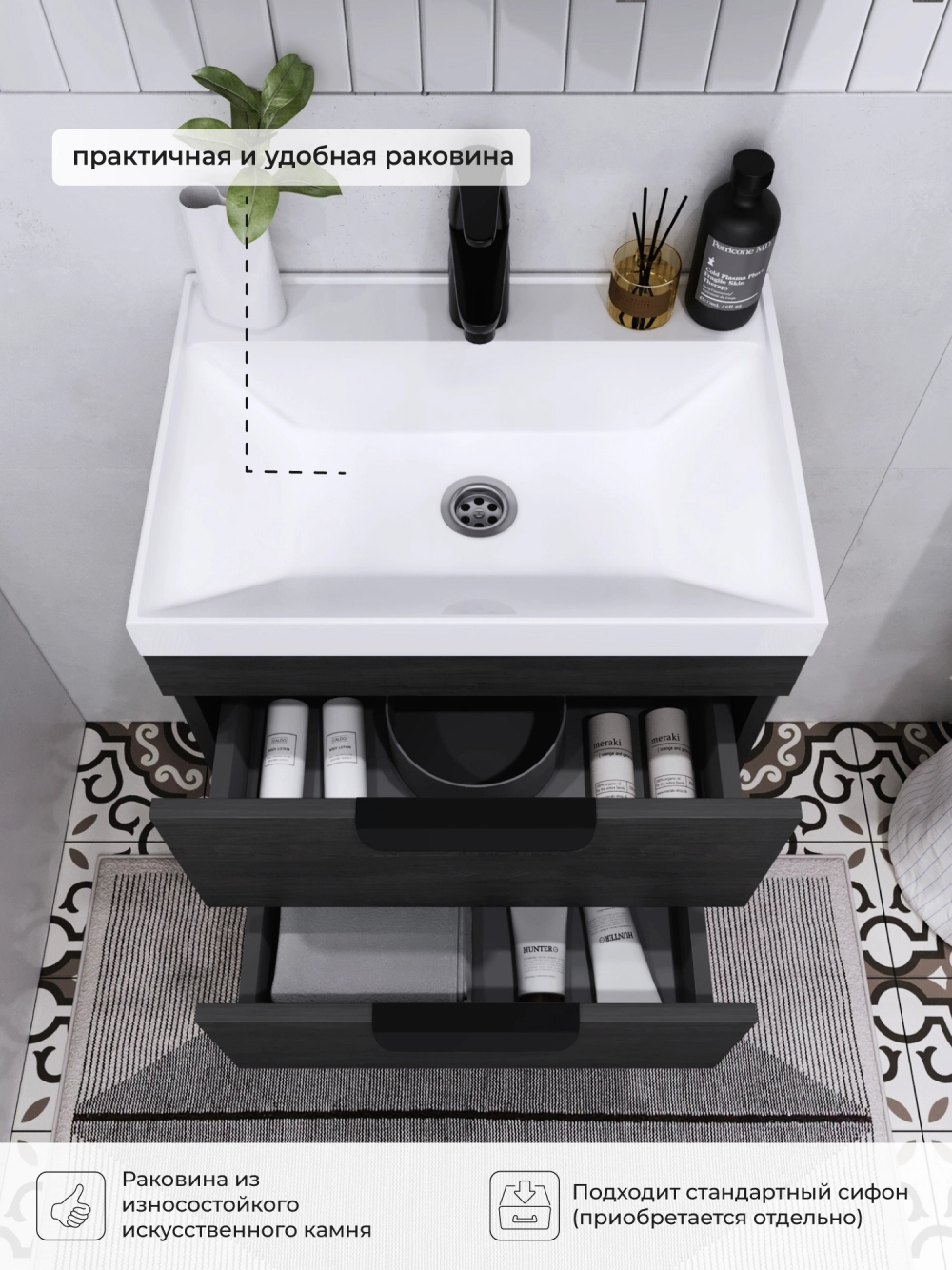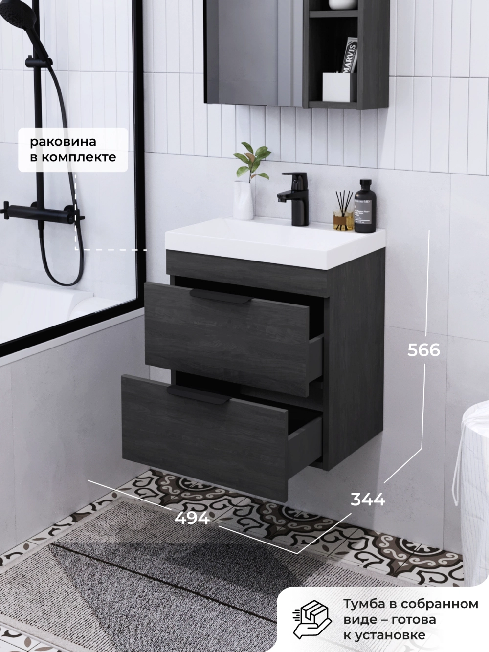 Подвесная тумба с раковиной из коллекции Alta станет настоящим украшением ванной комнаты в современном стиле. Навесной способ установки тумбы в ванную дает возможность не только визуально увеличить пространство, но и обеспечивает быстрый и удобный доступ для уборки. Размеры подвесной тумбы с раковиной 494*344*566 - идеальный выбор для ванной комнаты или туалета.Тумба с раковиной изготовлена из ламинированного ДСП, поэтому выдерживает высокие эксплуатационные нагрузки. Качественная фурнитура с доводчиками обеспечивает легкое открывание и плавное закрывание ящиков. Вырез под сифон универсальный, для любого типа. Благодаря своей конструкции тумба обеспечивает удобный доступ к раковине и позволяет скрыть коммуникации. Тумба с раковиной в ванную оснащена двумя удобными ящиками для хранения, что позволяет разместить всё необходимое под рукой. Раковина из искусственного камня– это безупречная гладкость поверхности, на которой не задерживаются загрязнения. Для точного выбора подвесной тумбы с раковиной в ванную комнату рекомендуем обратиться к схеме замеров, которая находится на фото в карточке товара, размеры изделия могут отличаться +/-1 см в связи со спецификой производства. Тумба для ванной доставляется в предварительно собранном виде, надежно упакована.