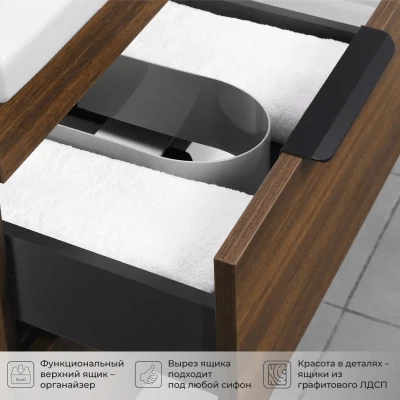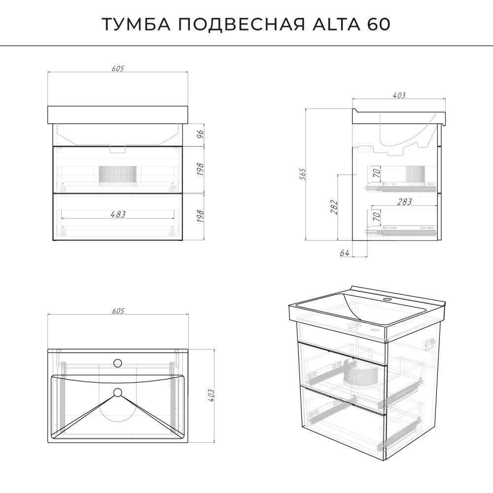 Подвесная тумба с раковиной из коллекции Alta станет настоящим украшением ванной комнаты в современном стиле. Навесной способ установки тумбы в ванную дает возможность не только визуально увеличить пространство, но и обеспечивает быстрый и удобный доступ для уборки. Размеры подвесной тумбы с раковиной 605*403*530 - идеальный выбор для ванной комнаты или туалета.Тумба с раковиной изготовлена из ламинированного ДСП, поэтому выдерживает высокие эксплуатационные нагрузки. Качественная фурнитура с доводчиками обеспечивает легкое открывание и плавное закрывание ящиков. Вырез под сифон универсальный, для любого типа. Благодаря своей конструкции тумба обеспечивает удобный доступ к раковине и позволяет скрыть коммуникации. Тумба с раковиной в ванную оснащена двумя удобными ящиками для хранения, что позволяет разместить всё необходимое под рукой. Раковина из искусственного камня– это безупречная гладкость поверхности, на которой не задерживаются загрязнения. Для точного выбора подвесной тумбы с раковиной в ванную комнату рекомендуем обратиться к схеме замеров, которая находится на фото в карточке товара, размеры изделия могут отличаться +/-1 см в связи со спецификой производства. Тумба для ванной доставляется в предварительно собранном виде, надежно упакована.