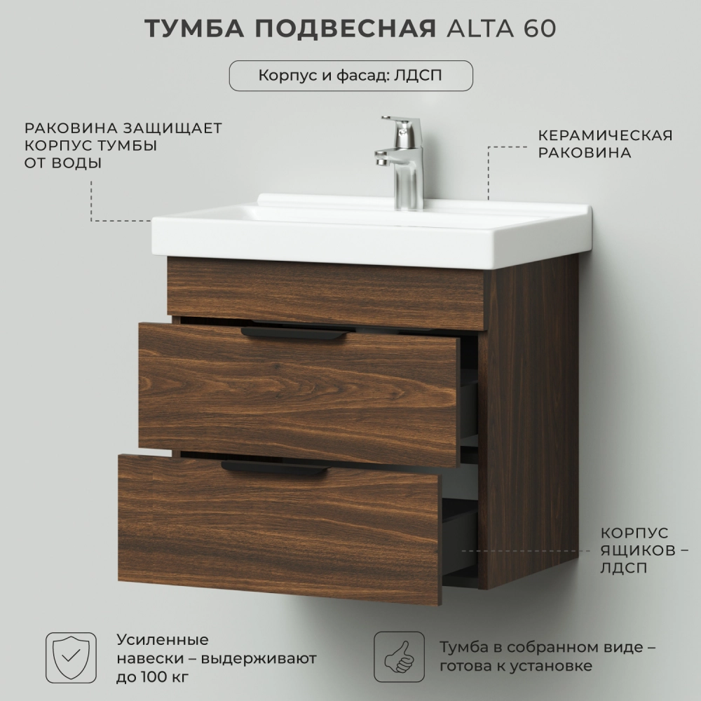 Тумба с раковиной подвесная Итана Alta 60 с выдвижными ящиками Дуб бурбон