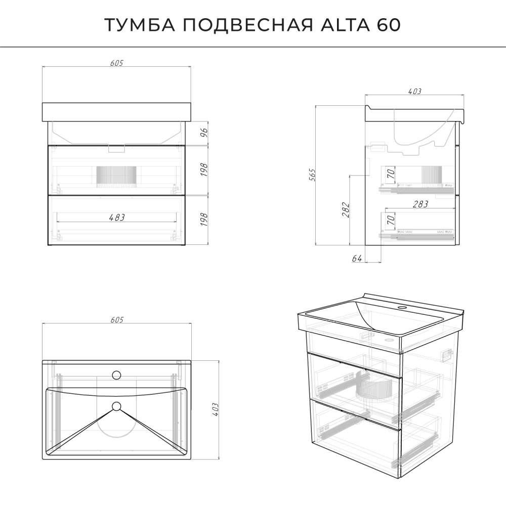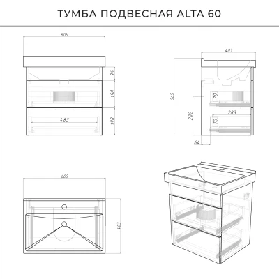 Подвесная тумба с раковиной из коллекции Alta станет настоящим украшением ванной комнаты в современном стиле. Навесной способ установки тумбы в ванную дает возможность не только визуально увеличить пространство, но и обеспечивает быстрый и удобный доступ для уборки. Размеры подвесной тумбы с раковиной 605*403*530 - идеальный выбор для ванной комнаты или туалета.Тумба с раковиной изготовлена из ламинированного ДСП, поэтому выдерживает высокие эксплуатационные нагрузки. Качественная фурнитура с доводчиками обеспечивает легкое открывание и плавное закрывание ящиков. Вырез под сифон универсальный, для любого типа. Благодаря своей конструкции тумба обеспечивает удобный доступ к раковине и позволяет скрыть коммуникации. Тумба с раковиной в ванную оснащена двумя удобными ящиками для хранения, что позволяет разместить всё необходимое под рукой. Раковина из искусственного камня– это безупречная гладкость поверхности, на которой не задерживаются загрязнения. Для точного выбора подвесной тумбы с раковиной в ванную комнату рекомендуем обратиться к схеме замеров, которая находится на фото в карточке товара, размеры изделия могут отличаться +/-1 см в связи со спецификой производства. Тумба для ванной доставляется в предварительно собранном виде, надежно упакована.