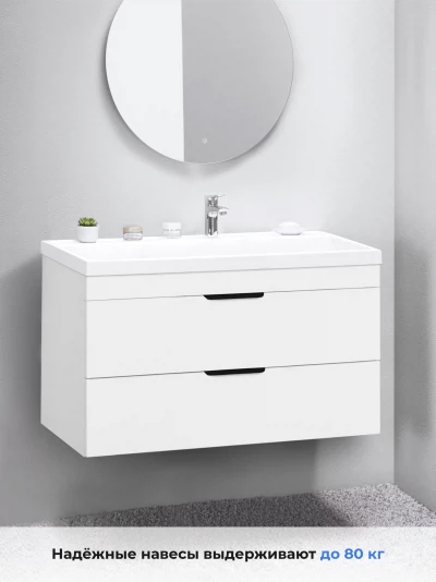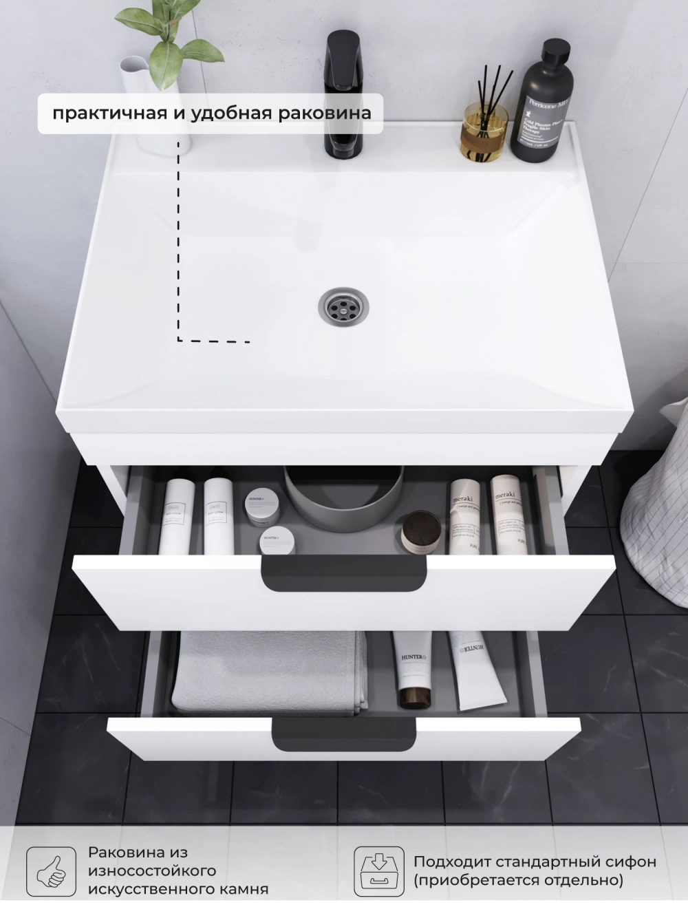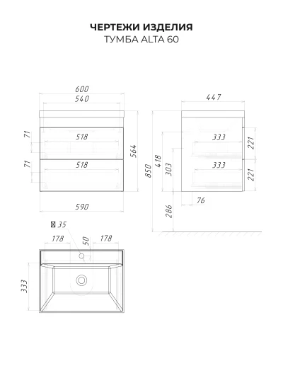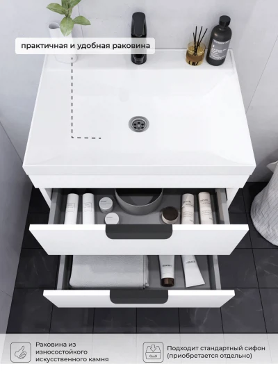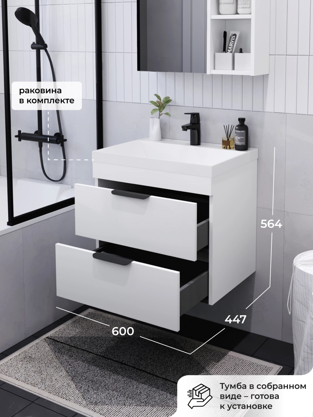 Подвесная тумба с раковиной из коллекции Alta станет настоящим украшением ванной комнаты в современном стиле. Навесной способ установки тумбы в ванную дает возможность не только визуально увеличить пространство, но и обеспечивает быстрый и удобный доступ для уборки. Размеры подвесной тумбы с раковиной 600*447*564 - идеальный выбор для ванной комнаты или туалета.Тумба с раковиной изготовлена из ламинированного ДСП, поэтому выдерживает высокие эксплуатационные нагрузки. Качественная фурнитура с доводчиками обеспечивает легкое открывание и плавное закрывание ящиков. Вырез под сифон универсальный, для любого типа. Благодаря своей конструкции тумба обеспечивает удобный доступ к раковине и позволяет скрыть коммуникации. Тумба с раковиной в ванную оснащена двумя удобными ящиками для хранения, что позволяет разместить всё необходимое под рукой. Раковина из искусственного камня– это безупречная гладкость поверхности, на которой не задерживаются загрязнения. Для точного выбора подвесной тумбы с раковиной в ванную комнату рекомендуем обратиться к схеме замеров, которая находится на фото в карточке товара, размеры изделия могут отличаться +/-1 см в связи со спецификой производства. Тумба для ванной доставляется в предварительно собранном виде, надежно упакована.