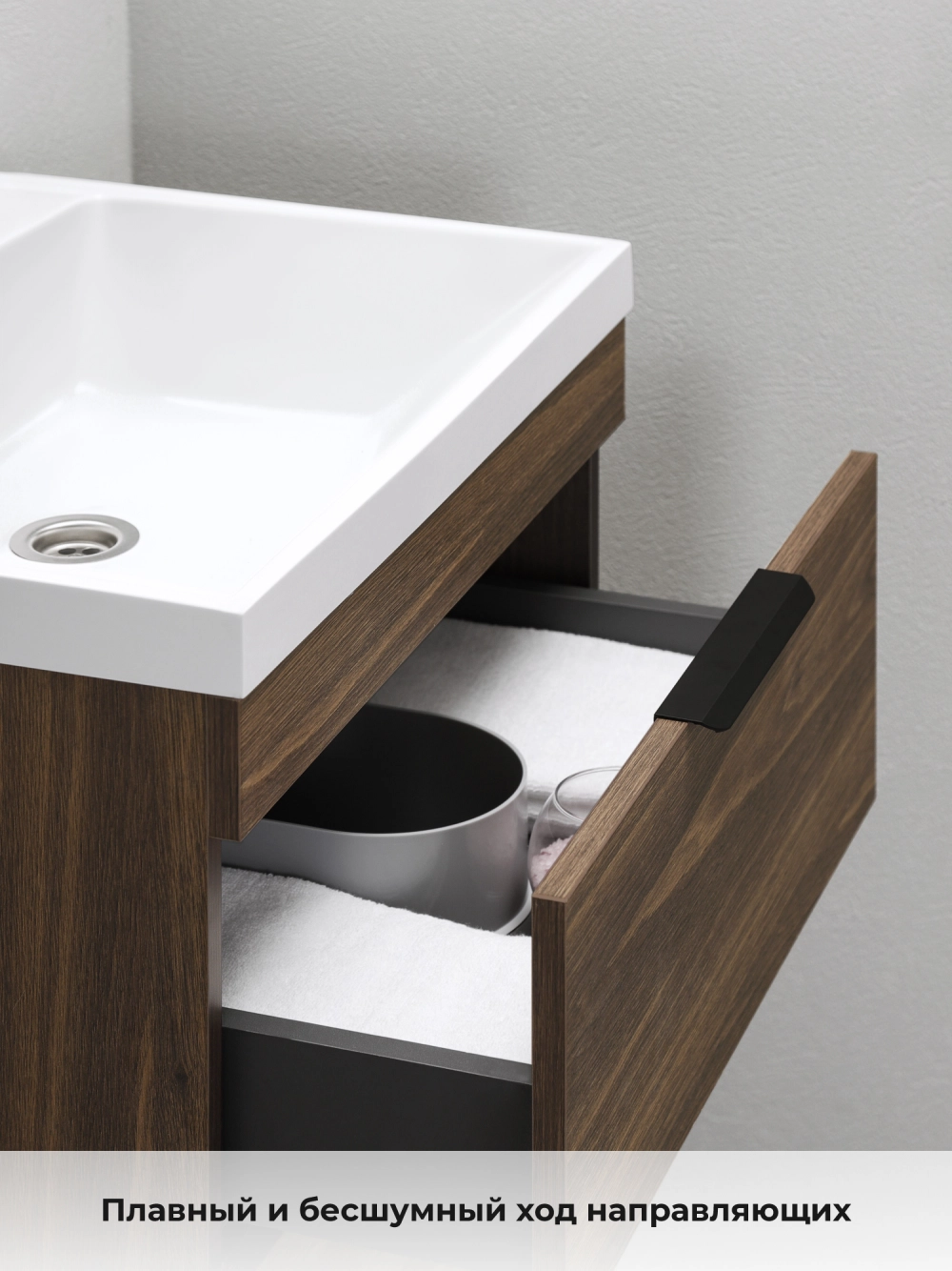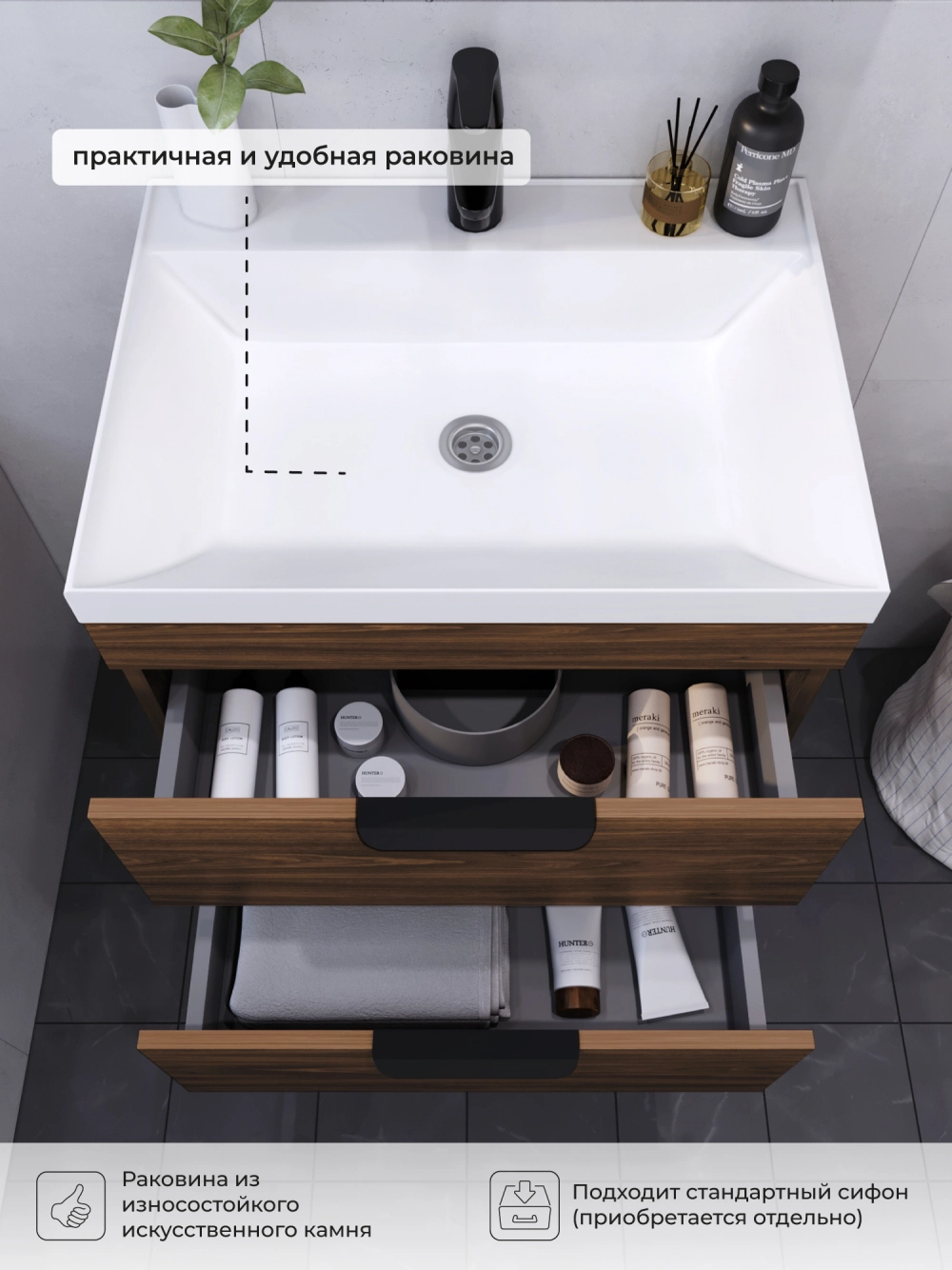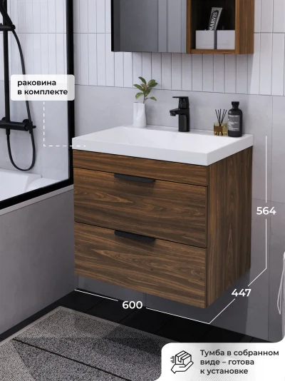 Подвесная тумба с раковиной из коллекции Alta станет настоящим украшением ванной комнаты в современном стиле. Навесной способ установки тумбы в ванную дает возможность не только визуально увеличить пространство, но и обеспечивает быстрый и удобный доступ для уборки. Размеры подвесной тумбы с раковиной 600*447*564 - идеальный выбор для ванной комнаты или туалета.Тумба с раковиной изготовлена из ламинированного ДСП, поэтому выдерживает высокие эксплуатационные нагрузки. Качественная фурнитура с доводчиками обеспечивает легкое открывание и плавное закрывание ящиков. Вырез под сифон универсальный, для любого типа. Благодаря своей конструкции тумба обеспечивает удобный доступ к раковине и позволяет скрыть коммуникации. Тумба с раковиной в ванную оснащена двумя удобными ящиками для хранения, что позволяет разместить всё необходимое под рукой. Раковина из искусственного камня– это безупречная гладкость поверхности, на которой не задерживаются загрязнения. Для точного выбора подвесной тумбы с раковиной в ванную комнату рекомендуем обратиться к схеме замеров, которая находится на фото в карточке товара, размеры изделия могут отличаться +/-1 см в связи со спецификой производства. Тумба для ванной доставляется в предварительно собранном виде, надежно упакована.
