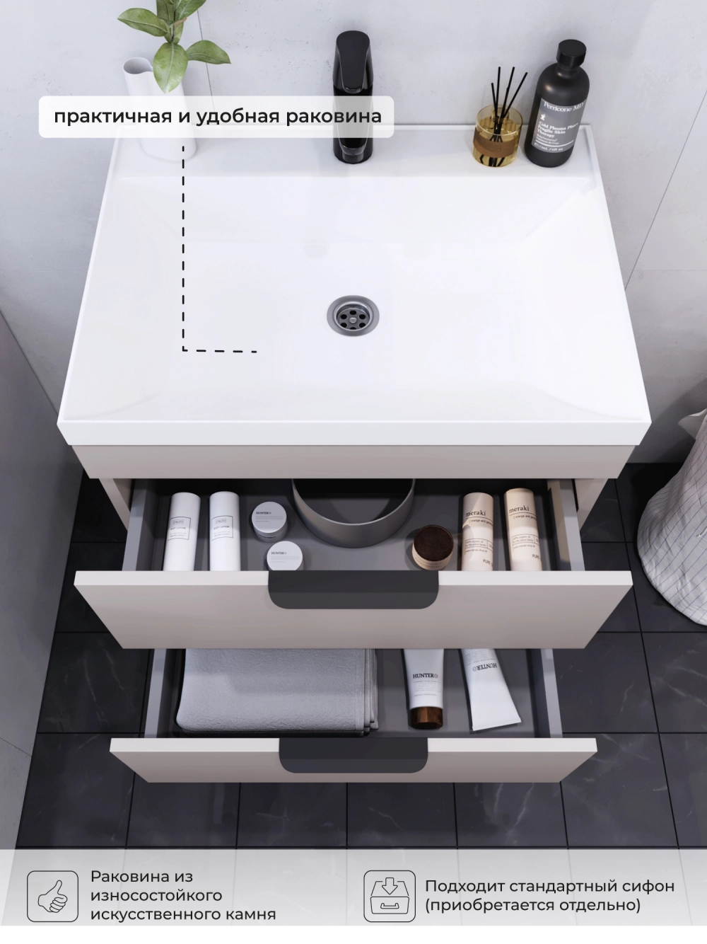 Подвесная тумба с раковиной из коллекции Alta станет настоящим украшением ванной комнаты в современном стиле. Навесной способ установки тумбы в ванную дает возможность не только визуально увеличить пространство, но и обеспечивает быстрый и удобный доступ для уборки. Размеры подвесной тумбы с раковиной 600*447*564 - идеальный выбор для ванной комнаты или туалета.Тумба с раковиной изготовлена из ламинированного ДСП, поэтому выдерживает высокие эксплуатационные нагрузки. Качественная фурнитура с доводчиками обеспечивает легкое открывание и плавное закрывание ящиков. Вырез под сифон универсальный, для любого типа. Благодаря своей конструкции тумба обеспечивает удобный доступ к раковине и позволяет скрыть коммуникации. Тумба с раковиной в ванную оснащена двумя удобными ящиками для хранения, что позволяет разместить всё необходимое под рукой. Раковина из искусственного камня– это безупречная гладкость поверхности, на которой не задерживаются загрязнения. Для точного выбора подвесной тумбы с раковиной в ванную комнату рекомендуем обратиться к схеме замеров, которая находится на фото в карточке товара, размеры изделия могут отличаться +/-1 см в связи со спецификой производства. Тумба для ванной доставляется в предварительно собранном виде, надежно упакована.