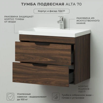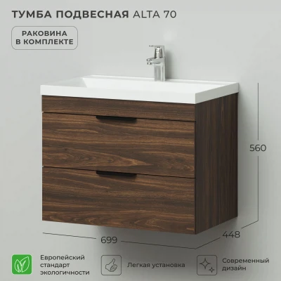 Тумба с раковиной подвесная Итана Alta 70 с выдвижными ящиками под умывальник Clarissa 70 Дуб бурбон