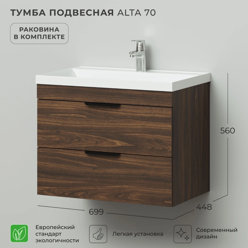 Подвесная тумба с раковиной из коллекции Alta станет настоящим украшением ванной комнаты в современном стиле. Навесной способ установки тумбы в ванную дает возможность не только визуально увеличить пространство, но и обеспечивает быстрый и удобный доступ для уборки. Размеры подвесной тумбы с раковиной 699*448*560 - идеальный выбор для ванной комнаты или туалета.Тумба с раковиной изготовлена из ламинированного ДСП, поэтому выдерживает высокие эксплуатационные нагрузки. Качественная фурнитура с доводчиками обеспечивает легкое открывание и плавное закрывание ящиков. Вырез под сифон универсальный, для любого типа. Благодаря своей конструкции тумба обеспечивает удобный доступ к раковине и позволяет скрыть коммуникации. Тумба с раковиной в ванную оснащена двумя удобными ящиками для хранения, что позволяет разместить всё необходимое под рукой. Раковина из искусственного камня– это безупречная гладкость поверхности, на которой не задерживаются загрязнения. Для точного выбора подвесной тумбы с раковиной в ванную комнату рекомендуем обратиться к схеме замеров, которая находится на фото в карточке товара, размеры изделия могут отличаться +/-1 см в связи со спецификой производства. Тумба для ванной доставляется в предварительно собранном виде, надежно упакована.