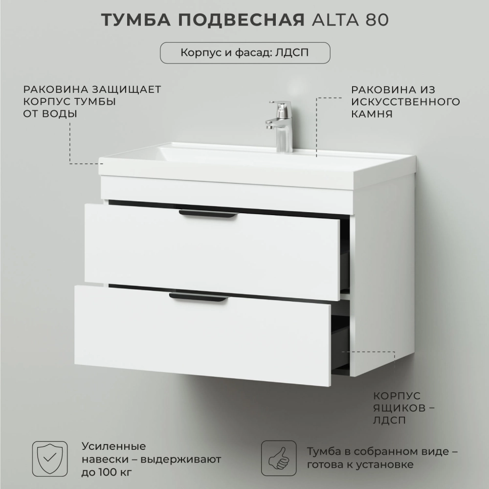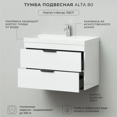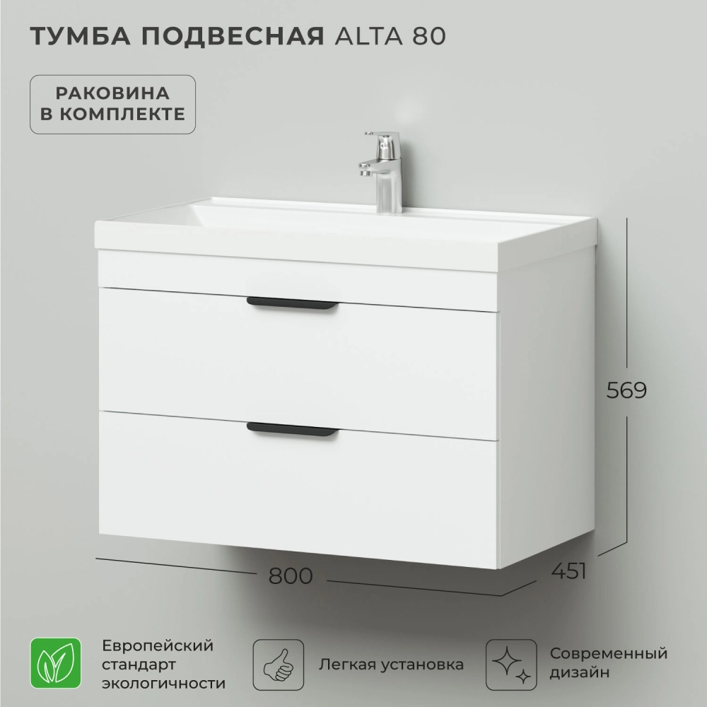 Подвесная тумба с раковиной из коллекции Alta станет настоящим украшением ванной комнаты в современном стиле. Навесной способ установки тумбы в ванную дает возможность не только визуально увеличить пространство, но и обеспечивает быстрый и удобный доступ для уборки. Размеры подвесной тумбы с раковиной 800*451*569 - идеальный выбор для ванной комнаты или туалета.Тумба с раковиной изготовлена из ламинированного ДСП, поэтому выдерживает высокие эксплуатационные нагрузки. Качественная фурнитура с доводчиками обеспечивает легкое открывание и плавное закрывание ящиков. Вырез под сифон универсальный, для любого типа. Благодаря своей конструкции тумба обеспечивает удобный доступ к раковине и позволяет скрыть коммуникации. Тумба с раковиной в ванную оснащена двумя удобными ящиками для хранения, что позволяет разместить всё необходимое под рукой. Раковина из искусственного камня– это безупречная гладкость поверхности, на которой не задерживаются загрязнения. Для точного выбора подвесной тумбы с раковиной в ванную комнату рекомендуем обратиться к схеме замеров, которая находится на фото в карточке товара, размеры изделия могут отличаться +/-1 см в связи со спецификой производства. Тумба для ванной доставляется в предварительно собранном виде, надежно упакована.