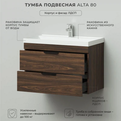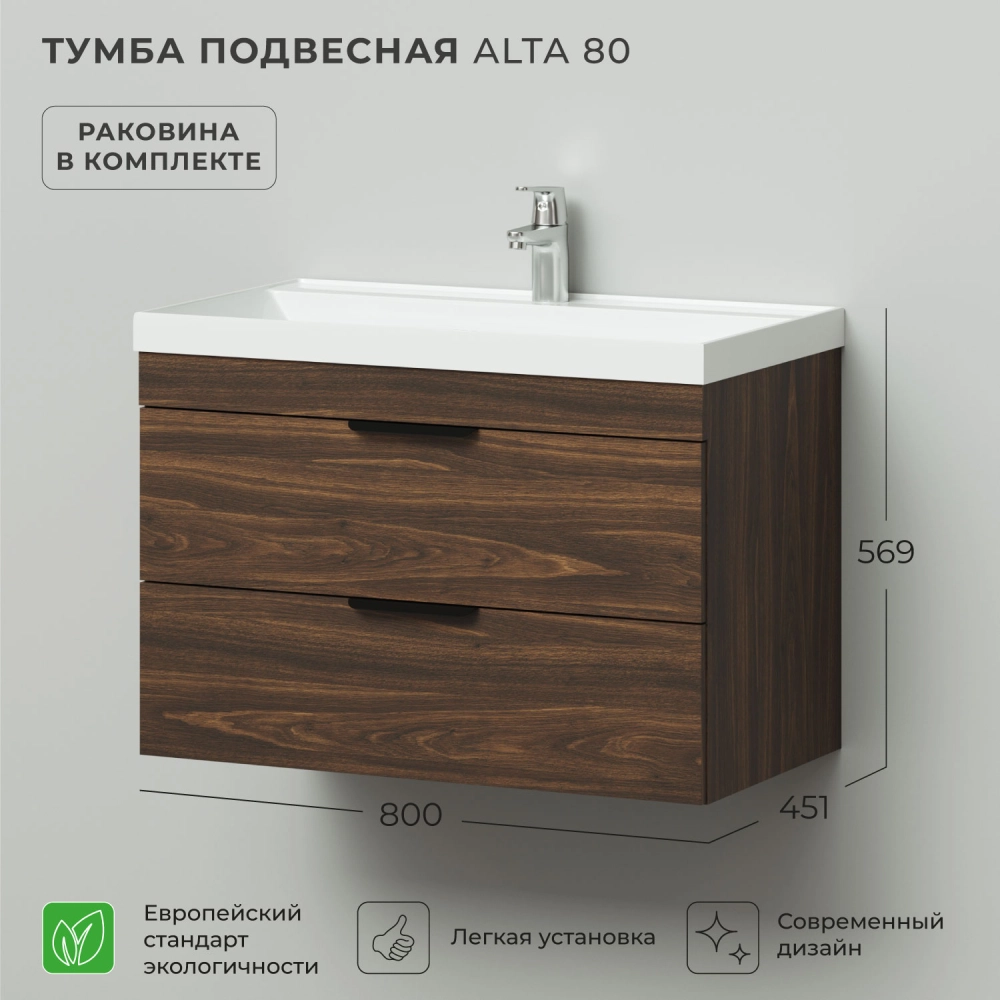 Подвесная тумба с раковиной из коллекции Alta станет настоящим украшением ванной комнаты в современном стиле. Навесной способ установки тумбы в ванную дает возможность не только визуально увеличить пространство, но и обеспечивает быстрый и удобный доступ для уборки. Размеры подвесной тумбы с раковиной 800*451*569 - идеальный выбор для ванной комнаты или туалета.Тумба с раковиной изготовлена из ламинированного ДСП, поэтому выдерживает высокие эксплуатационные нагрузки. Качественная фурнитура с доводчиками обеспечивает легкое открывание и плавное закрывание ящиков. Вырез под сифон универсальный, для любого типа. Благодаря своей конструкции тумба обеспечивает удобный доступ к раковине и позволяет скрыть коммуникации. Тумба с раковиной в ванную оснащена двумя удобными ящиками для хранения, что позволяет разместить всё необходимое под рукой. Раковина из искусственного камня– это безупречная гладкость поверхности, на которой не задерживаются загрязнения. Для точного выбора подвесной тумбы с раковиной в ванную комнату рекомендуем обратиться к схеме замеров, которая находится на фото в карточке товара, размеры изделия могут отличаться +/-1 см в связи со спецификой производства. Тумба для ванной доставляется в предварительно собранном виде, надежно упакована.
