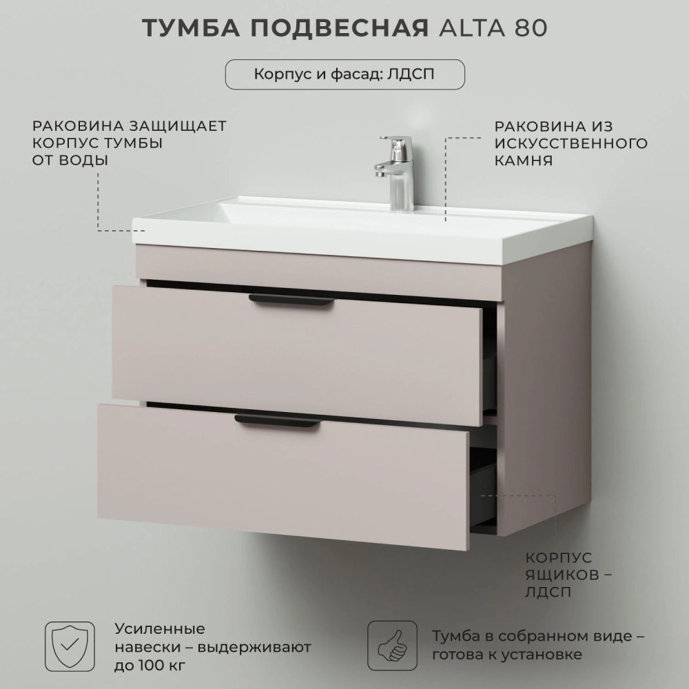 Тумба с раковиной подвесная Итана Alta 80 с выдвижными ящиками под умывальник Clarissa 80 Кашемир серый