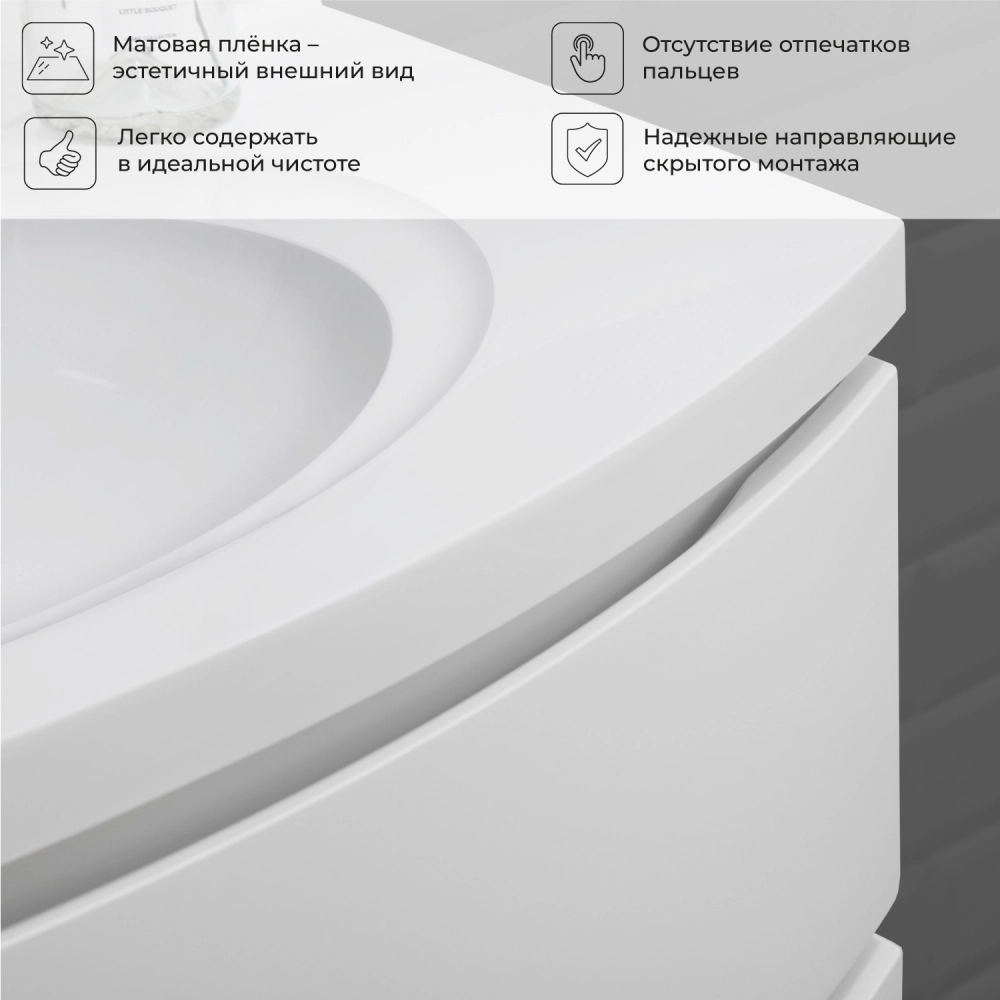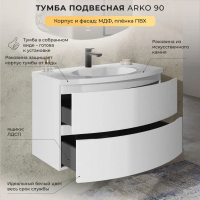 Подвесная тумба с раковиной Итана Arko 90 станет не только стильным акцентом для вашей ванной комнаты. Эстетически привлекательный дизайн с радиусными фасадами подчеркивает современный стиль интерьера. Благодаря подвесной конструкции, такая мебель значительно упрощает уборку, обеспечивая легкий доступ к полу. Тумба с раковиной в ванную изготовлена из высококачественных материалов, что гарантирует долгий срок службы и сохранность внешнего вида на протяжении многих лет. Продуманное до мелочей исполнение фасадов, мягкость линий и современный дизайн делают её отличным дополнением к любой ванной комнате. Качественная фурнитура с доводчиками обеспечивает легкое открывание и плавное закрывание ящиков. Тумба с раковиной с ящиками, где можно рационально распределить и разместить все необходимые вещи для ванной комнаты. Для точного выбора тумбы рекомендуем обратиться к схеме замеров, которая находится на фото в карточке товара. Размеры изделия могут отличаться +/-1 см в связи со спецификой производства. Подвесная тумба с раковиной приходит в надежной упаковке и в собранном виде.
