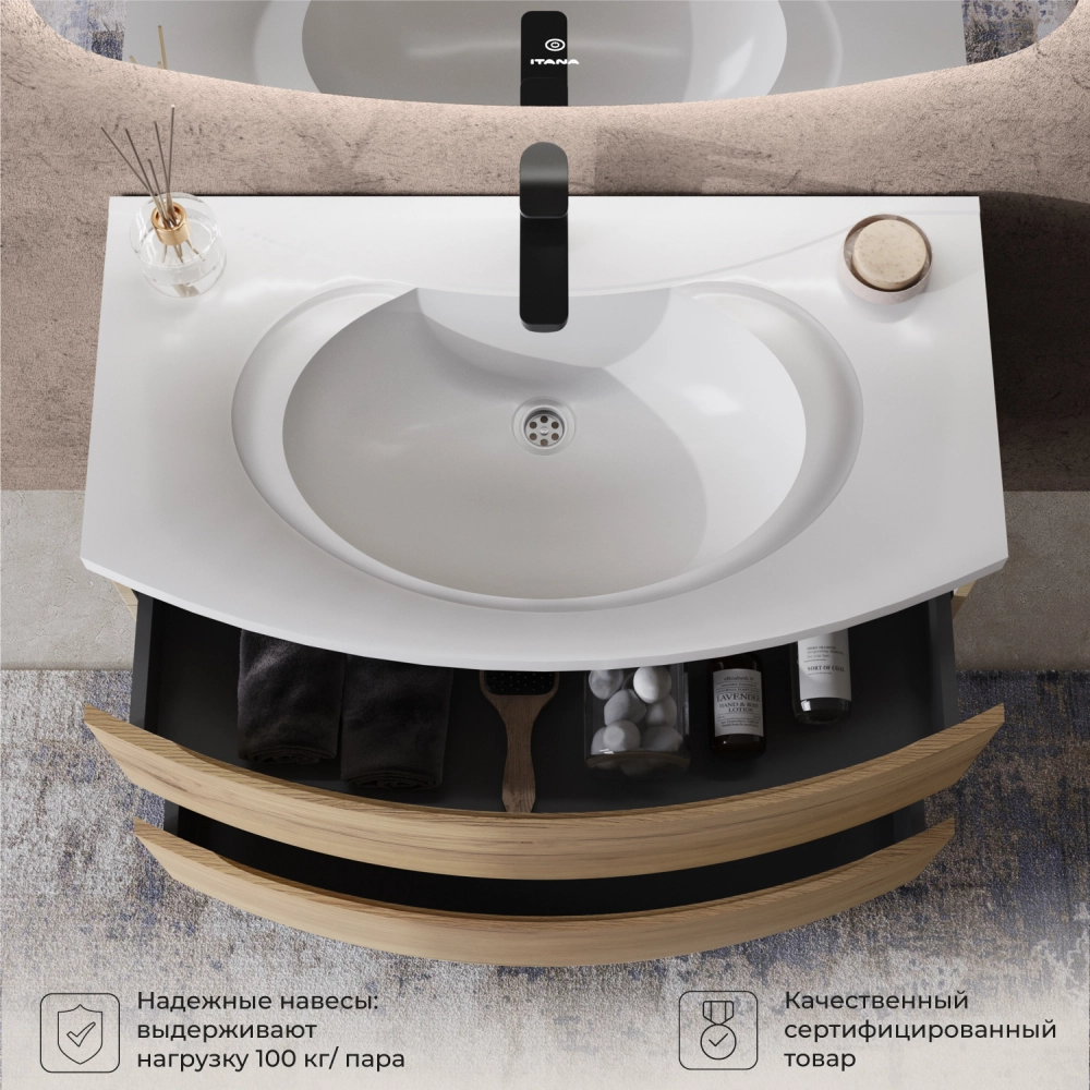 Подвесная тумба с раковиной Итана Arko 90 станет не только стильным акцентом для вашей ванной комнаты. Эстетически привлекательный дизайн с радиусными фасадами подчеркивает современный стиль интерьера. Благодаря подвесной конструкции, такая мебель значительно упрощает уборку, обеспечивая легкий доступ к полу. Тумба с раковиной в ванную изготовлена из высококачественных материалов, что гарантирует долгий срок службы и сохранность внешнего вида на протяжении многих лет. Продуманное до мелочей исполнение фасадов, мягкость линий и современный дизайн делают её отличным дополнением к любой ванной комнате. Качественная фурнитура с доводчиками обеспечивает легкое открывание и плавное закрывание ящиков. Тумба с раковиной с ящиками, где можно рационально распределить и разместить все необходимые вещи для ванной комнаты. Для точного выбора тумбы рекомендуем обратиться к схеме замеров, которая находится на фото в карточке товара. Размеры изделия могут отличаться +/-1 см в связи со спецификой производства. Подвесная тумба с раковиной приходит в надежной упаковке и в собранном виде.