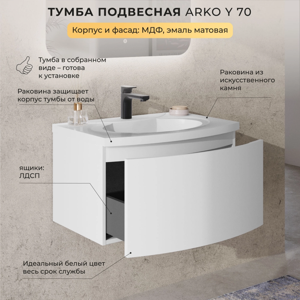 Тумба с раковиной подвесная Итана Arko Y 70 с радиусным фасадом Эмаль Белый матовый
