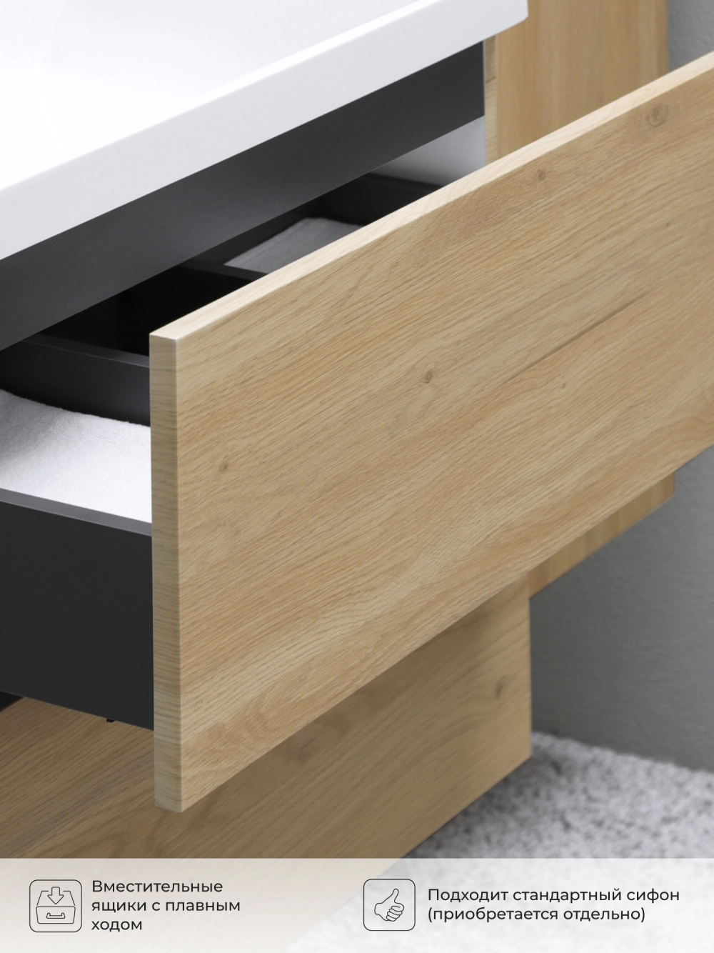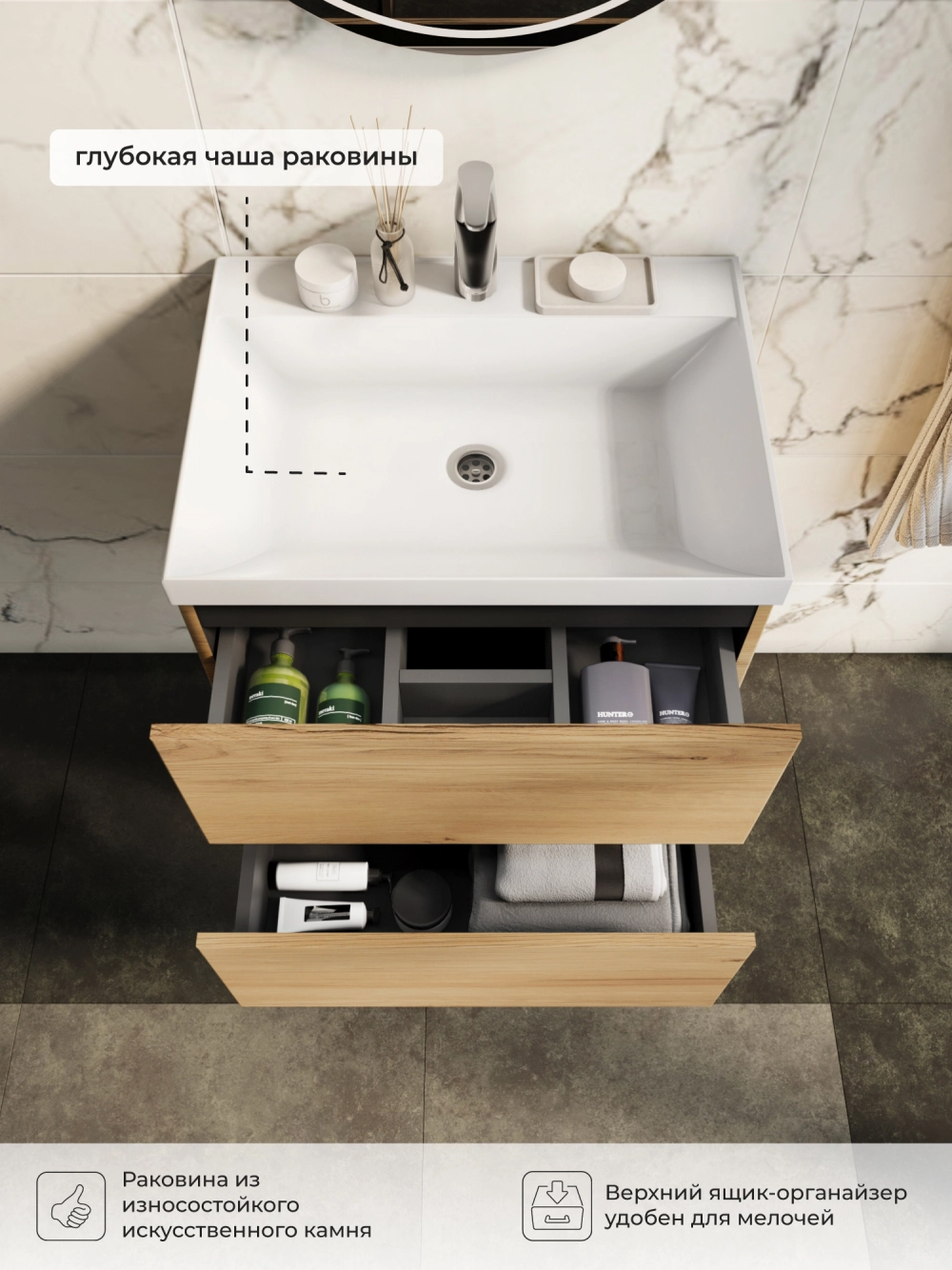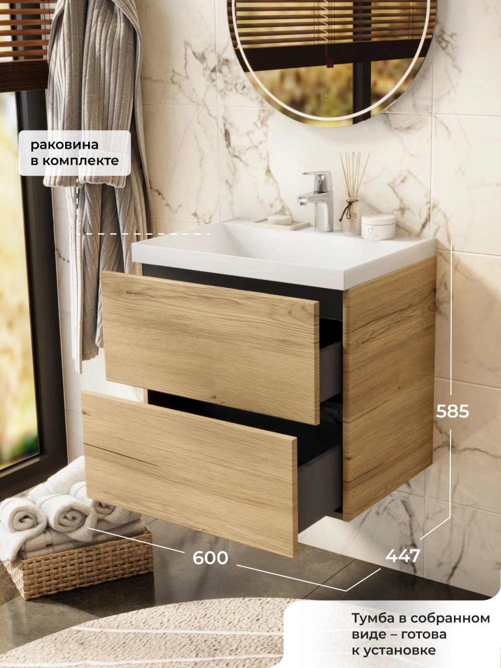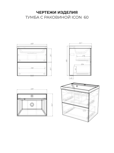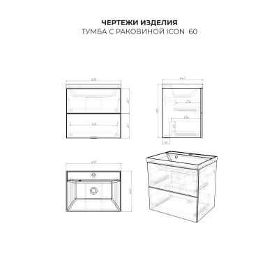Подвесная тумба с раковиной в ванную комнату из коллекции Icon - это сочетание современной стилистики и богатого функционала. Навесной способ установки тумбы в ванную дает возможность не только визуально увеличить пространство, но и обеспечивает быстрый и удобный доступ для уборки. Размеры подвесной тумбы с раковиной 600х447х585 - идеальный выбор для ванной комнаты или туалета. Качественная фурнитура с доводчиками обеспечивает легкое открывание и плавное закрывание ящиков. Тумба с раковиной с двумя ящиками, где можно рационально распределить и разместить все необходимые вещи для ванной комнаты. Вырез под сифон универсальный, для любого типа сифона. Раковина из искусственного камня – это безупречная гладкость поверхности, на которой не задерживаются загрязнения. Для точного выбора тумбы с раковиной в ванную комнату рекомендуем обратиться к схеме замеров, которая находится на фото в карточке товара, размеры изделия могут отличаться +/-1 см в связи со спецификой производства. Тумба с раковиной для ванной доставляется в предварительно собранном виде, надежно упакована.