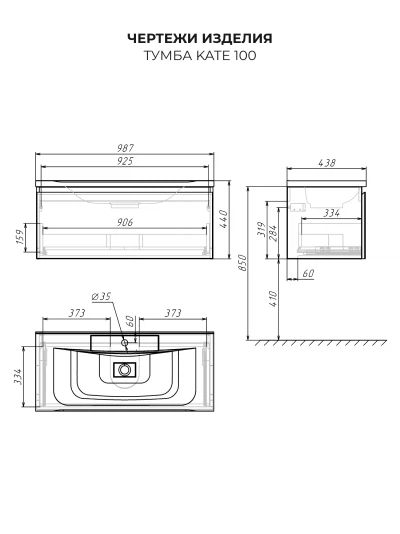 Тумба с раковиной подвесная Итана Kate 100 с выдвижным ящиком Антрацит