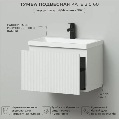 Подвесная тумба с раковиной из коллекции Kate станет настоящим украшением ванной комнаты в современном стиле. Навесной способ установки тумбы в ванную дает возможность не только визуально увеличить пространство, но и обеспечивает быстрый и удобный доступ для уборки. Размеры подвесной тумбы с раковиной 602*377*440 - идеальный выбор для ванной комнаты или туалета. Тумба для ванны изготовлена из МДФ и покрыта ПВХ пленкой, поэтому выдерживает высокие эксплуатационные нагрузки. Качественная фурнитура с доводчиками обеспечивает легкое открывание и плавное закрывание ящиков. Вырез под сифон универсальный, для любого типа. Благодаря своей конструкции тумба обеспечивает удобный доступ к раковине и позволяет скрыть коммуникации. Тумба с раковиной в ванную оснащена удобным ящиком для хранения, что позволяет разместить всё необходимое под рукой. Раковина из искусственого камня– это безупречная гладкость поверхности, на которой не задерживаются загрязнения. Для точного выбора тумбы с раковиной в ванную комнату рекомендуем обратиться к схеме замеров, которая находится на фото в карточке товара, размеры изделия могут отличаться +/-1 см в связи со спецификой производства. Тумба для ванной доставляется в предварительно собранном виде, надежно упакована.