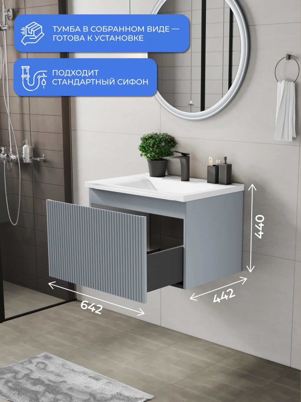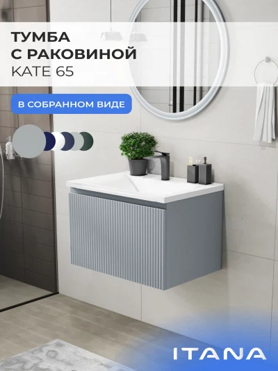 Подвесная тумба с раковиной Итана Kate 65 станет идеальным дополнением для вашей ванной комнаты, сочетая в себе стильный дизайн и функциональность. Коллекция Kate - воплотила в себе тренд на фактурные фасады. Идеальный "рубчик" - простое и стильное дизайнерское решение для декорирования фасадов - эта мебель бесспорно станет украшением современной ванной комнаты. Элегантная подвесная конструкция позволяет максимально эффективно использовать пространство, создавая ощущение легкости и визуальной свободы в интерьере. Тумба изготовлена из высококачественных материалов, гарантируя долговечность и надежность эксплуатации. Удобные фрезерованные ручки, качественная фурнитура с доводчиками, вместительность - мы продумали все, чтобы тумба под раковину была не просто красивой, но еще и функциональной, приятной в использовании. Ее конструкция позволяет легко поддерживать порядок в ванной, ведь все мелочи будут аккуратно убраны. Раковина выполнена из искусственного камня, обладает устойчивостью к механическим повреждениям и влиянию химических средств. Стильный декор тумбы с раковиной добавляет изюминку в общий дизайн, вписываясь в современные и классические интерьеры. Удобные выдвижные ящики обеспечивают простоту доступа к содержимому тумбы. Подвесная тумба для ванной Итана Kate 65 — это также безопасность и удобство в уборке, так как свободное пространство под ней позволяет легко очистить пол. Безупречное сочетание раковины с тумбой подчеркивает общий стиль вашей ванной комнаты, делая ее уютной и функциональной. Для точного выбора тумбочки с раковиной в ванную комнату рекомендуем обратиться к схеме замеров, которая находится на фото в карточке товара, размеры изделия могут отличаться +/-1 см в связи со спецификой производства. Тумба для ванной доставляется в предварительно собранном виде, надежно упакована.