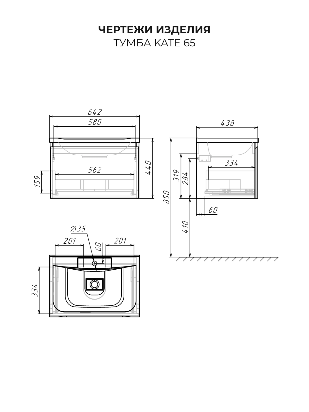 Тумба с раковиной подвесная Итана Kate 65 с выдвижным ящиком Green wood