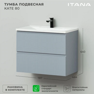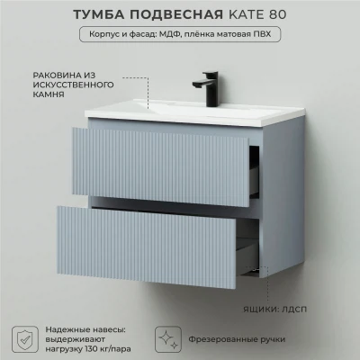 Подвесная тумба с раковиной из коллекции Kate станет настоящим украшением ванной комнаты в современном стиле. Навесной способ установки тумбы в ванную дает возможность не только визуально увеличить пространство, но и обеспечивает быстрый и удобный доступ для уборки. Размеры подвесной тумбы с раковиной 787*444*640 - идеальный выбор для ванной комнаты или туалета. Тумба для ванны изготовлена из МДФ и покрыта ПВХ пленкой, поэтому выдерживает высокие эксплуатационные нагрузки. Качественная фурнитура с доводчиками обеспечивает легкое открывание и плавное закрывание ящиков. Вырез под сифон универсальный, для любого типа. Благодаря своей конструкции тумба обеспечивает удобный доступ к раковине и позволяет скрыть коммуникации. Тумба с раковиной в ванную оснащена двумя удобными ящиками для хранения, что позволяет разместить всё необходимое под рукой. Раковина из искусственого камня– это безупречная гладкость поверхности, на которой не задерживаются загрязнения. Для точного выбора тумбы с раковиной в ванную комнату рекомендуем обратиться к схеме замеров, которая находится на фото в карточке товара, размеры изделия могут отличаться +/-1 см в связи со спецификой производства. Тумба для ванной доставляется в предварительно собранном виде, надежно упакована.