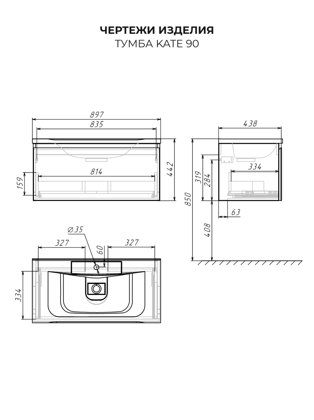 Тумба с раковиной подвесная Итана Kate 90 с выдвижным ящиком Океания