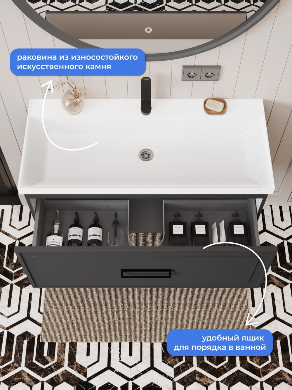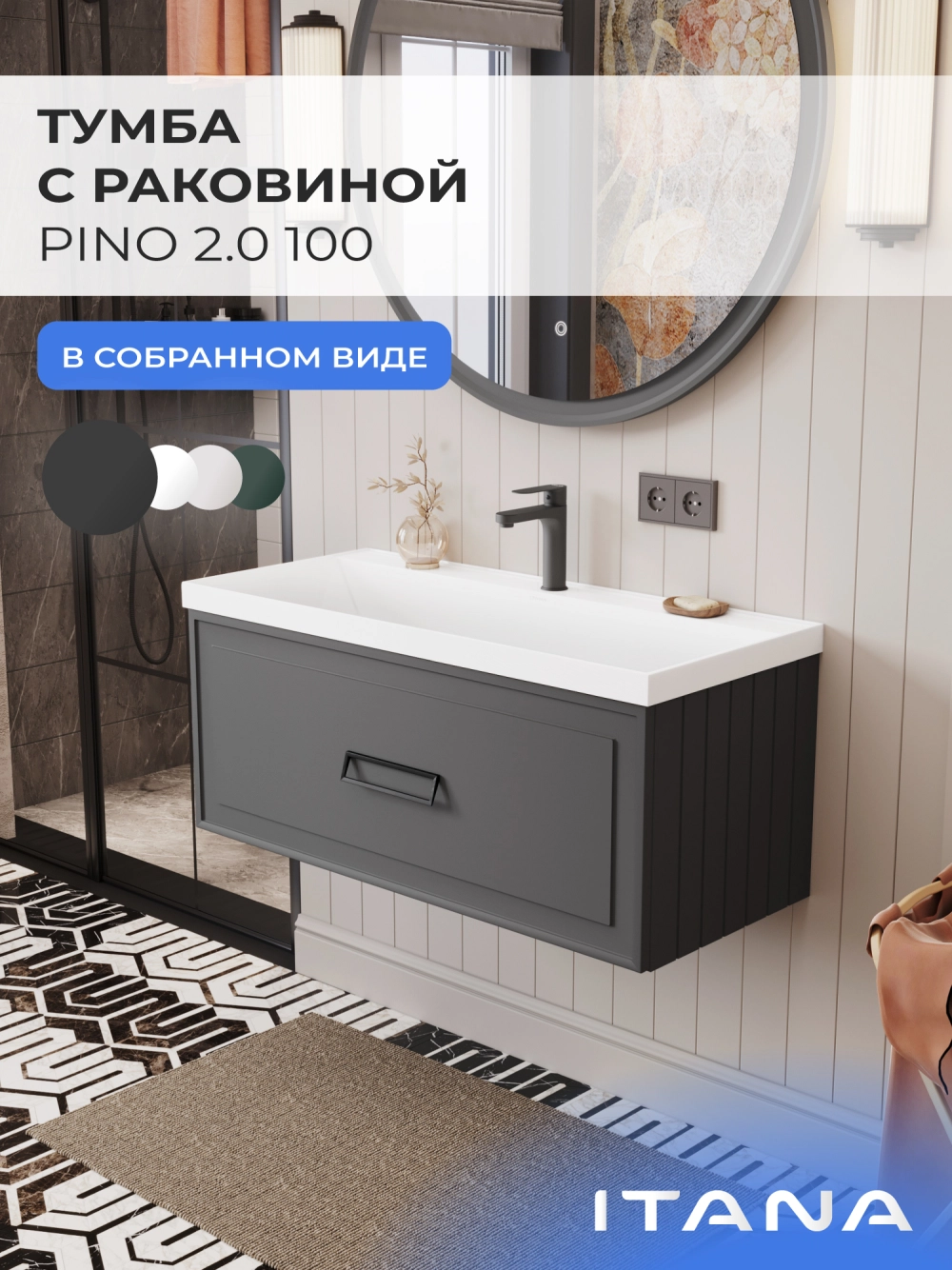 Тумба с раковиной подвесная Итана Pino 2.0 100 с выдвижным ящиком Графит