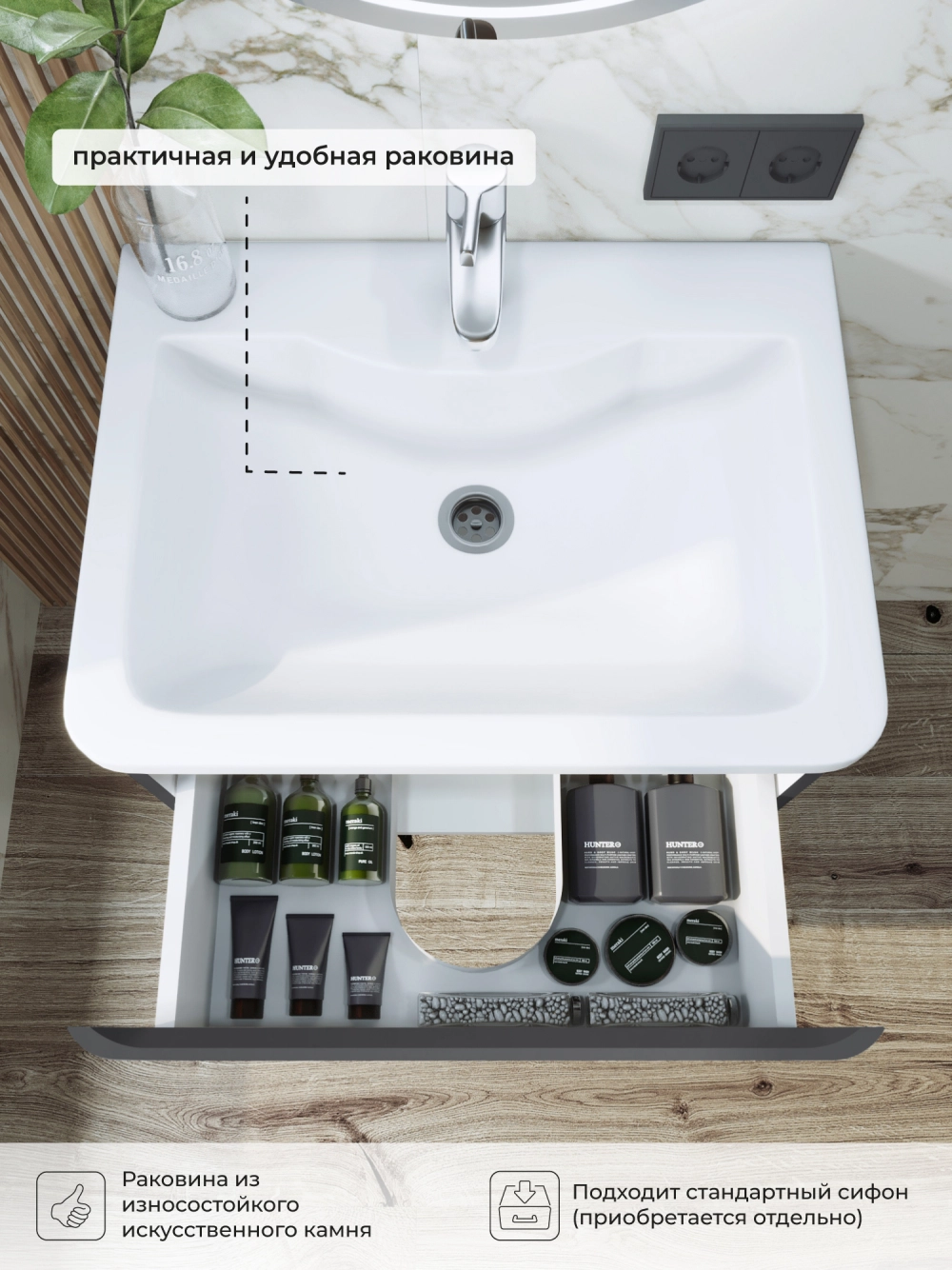 Подвесная тумба с раковиной в ванную из коллекции Roberto - это сочетание современной стилистики и богатого функционала. Тумба для ванны изготовлена из прочного МДФ, поэтому выдерживает высокие эксплуатационные нагрузки. Корпус и фасады тумбы для ванной покрыты пленкой, что обеспечивает дополнительную защиту тумбы с раковиной от влаги и перепадов температуры. Качественная фурнитура с доводчиками обеспечивает легкое открывание и плавное закрывание ящиков. Вырез под сифон универсальный, для любого типа. Благодаря своей конструкции тумба обеспечивает удобный доступ к раковине и позволяет скрыть коммуникации. Тумба с раковиной в ванную оснащена удобным ящиком для хранения, что позволяет разместить всё необходимое под рукой. Ручки интегрированы в фасад, что исключает возможность случайного удара о фурнитуру. Для точного выбора тумбы с раковиной в ванную комнату рекомендуем обратиться к схеме замеров, которая находится на фото в карточке товара, размеры изделия могут отличаться +/-1 см в связи со спецификой производства. Тумба для ванной доставляется в предварительно собранном виде, надежно упакована.